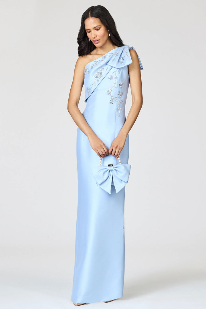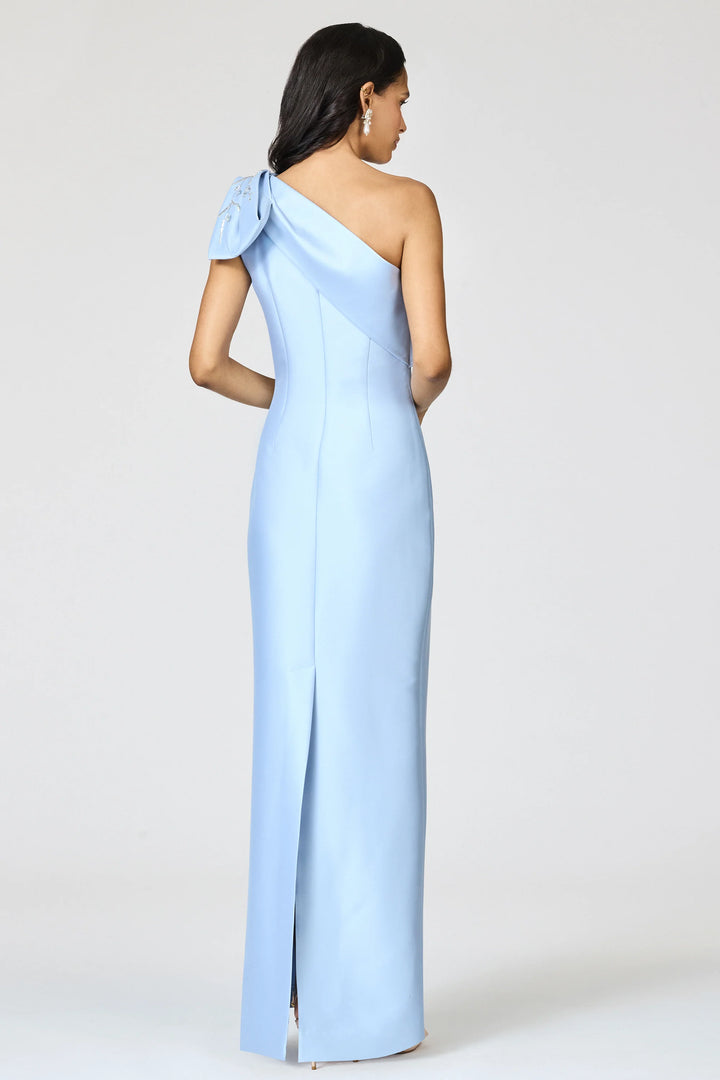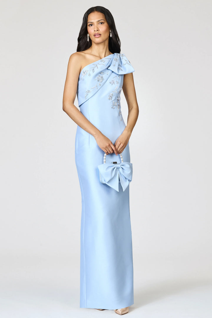 Meet Olivia, a modified take on the iconic Bonnie. Here in Glacial Blue, with floral embellishment throughout the bodice, artfully embroidered by 3rd generation artisans at a family-owned atelier in Mumbai. This one-shoulder silhouette has a uniquely imagined bow that is hand-applied and embroidered.