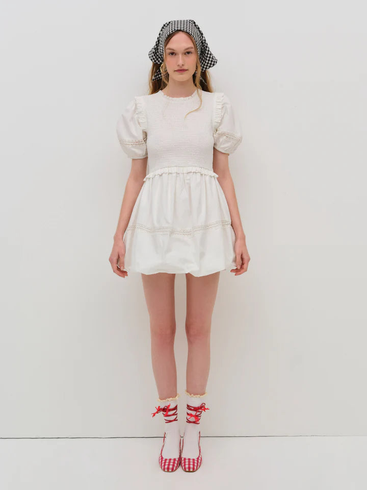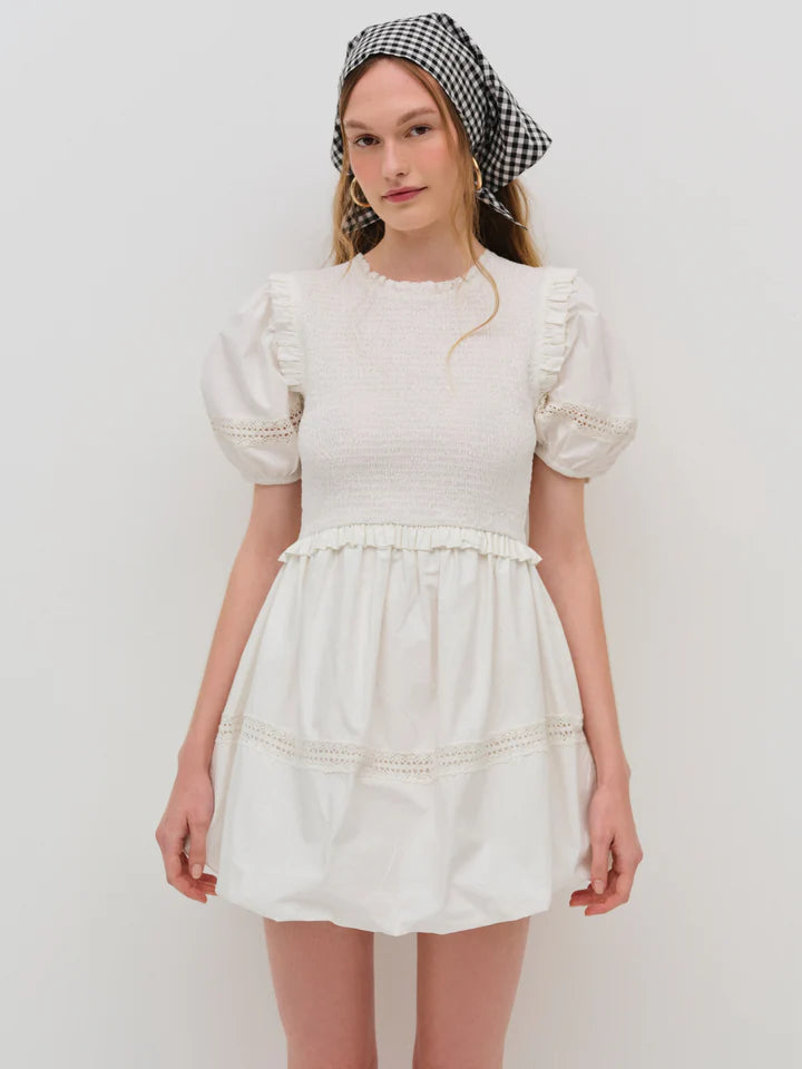 Crafted in a crisp cotton poplin, the Sandy Mini Dress by For Love & Lemons is your perfect casual dress for sun-baked days. It features puff sleeves, a fully smocked bodice, a bubble hem, and exposed crochet trims throughout.