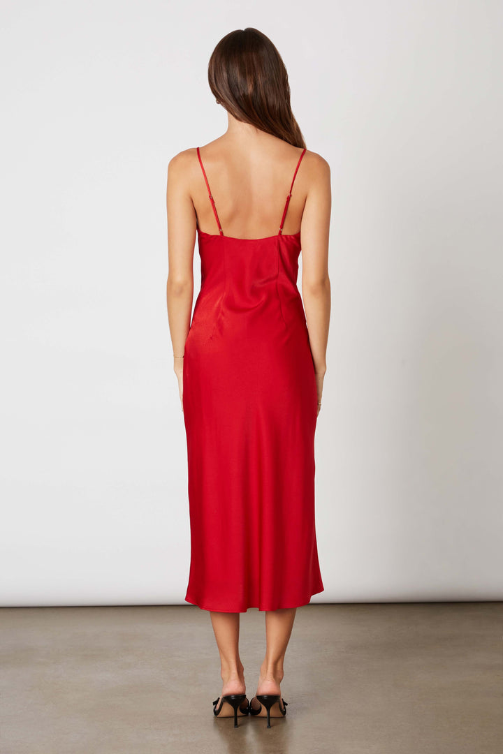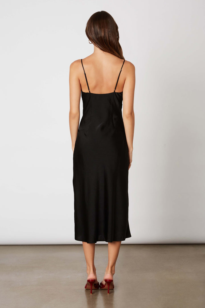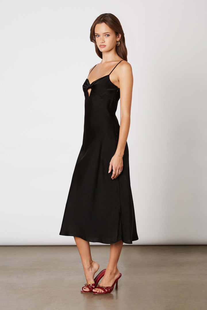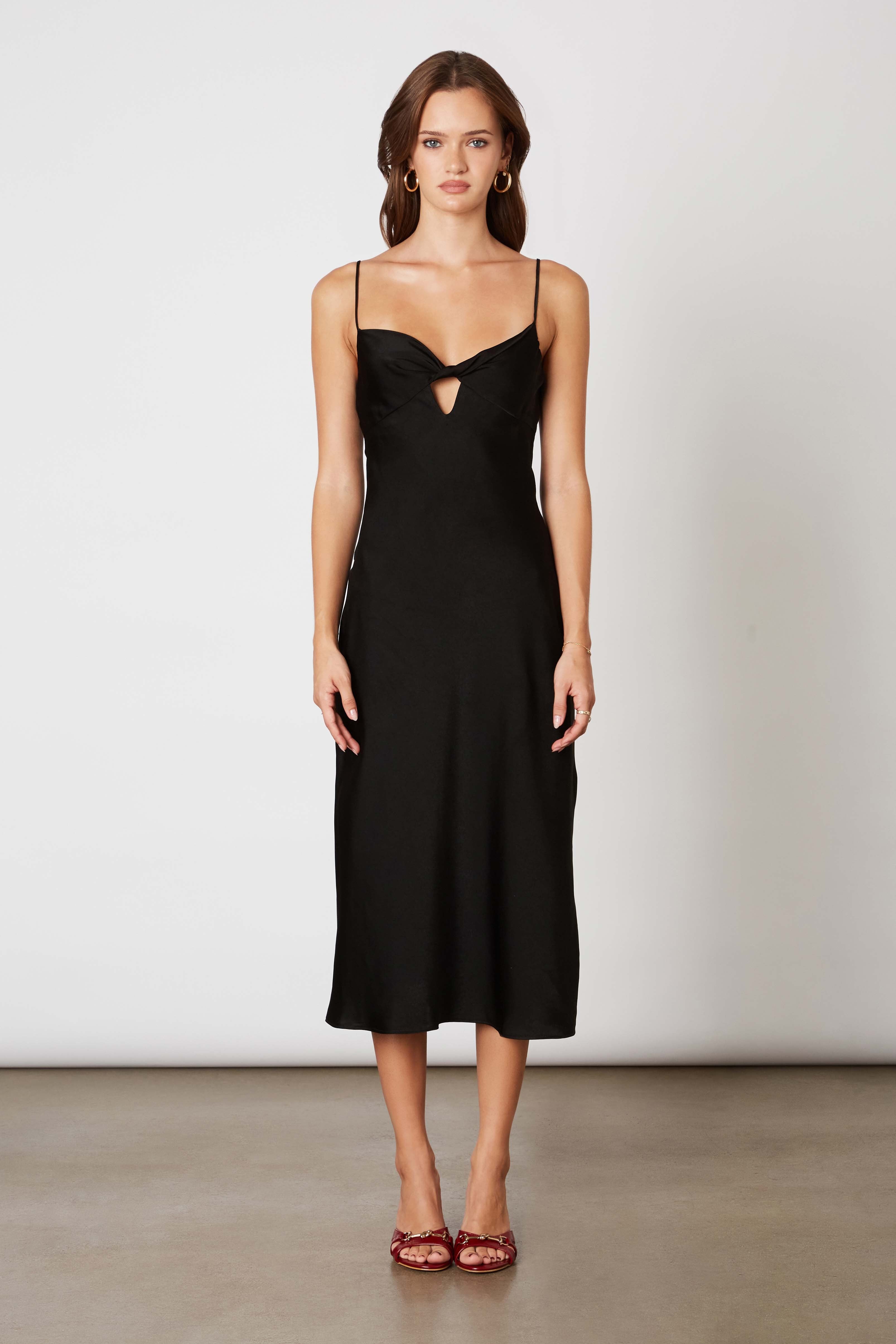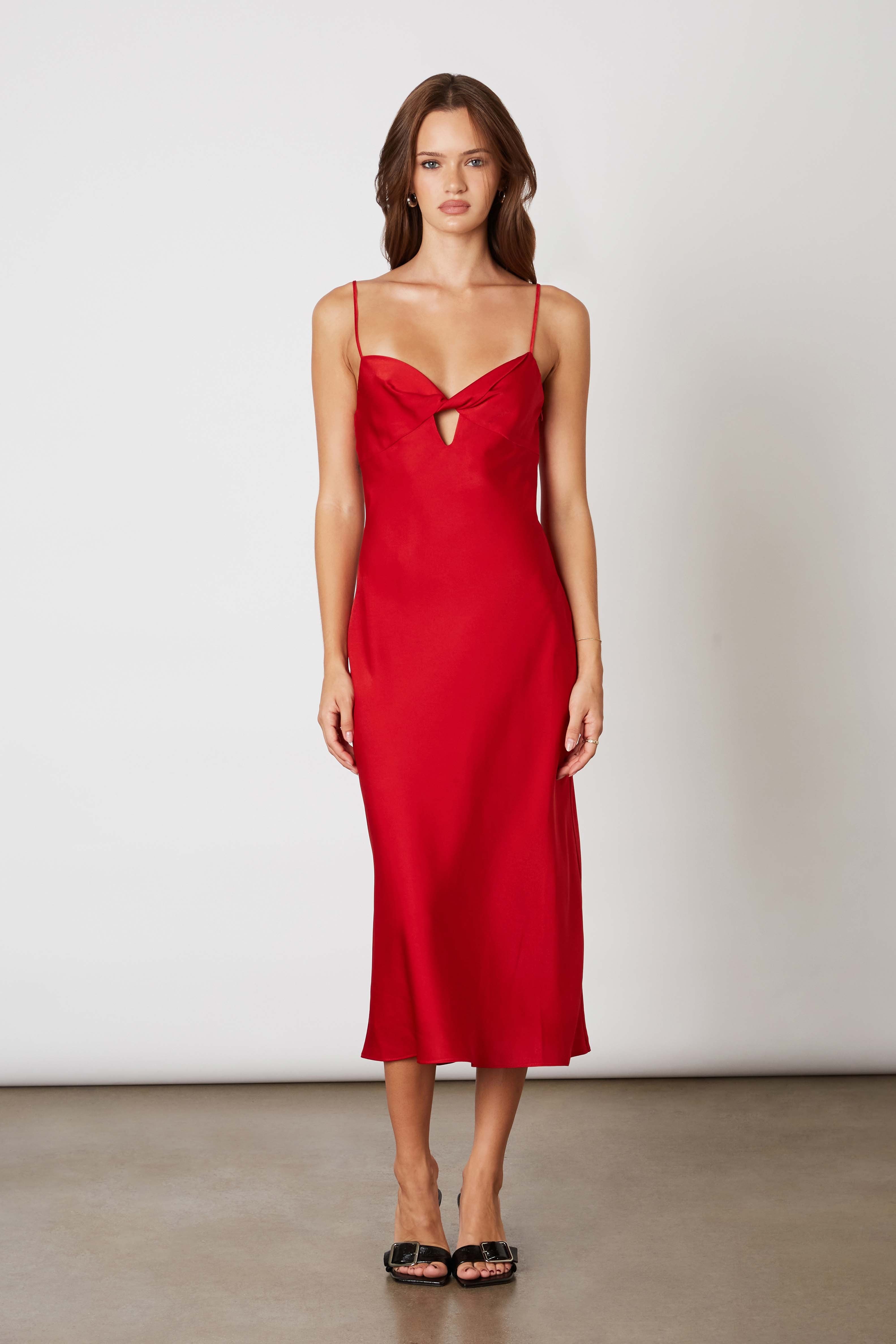 Spaghetti strap midi satin dress with front keyhole.