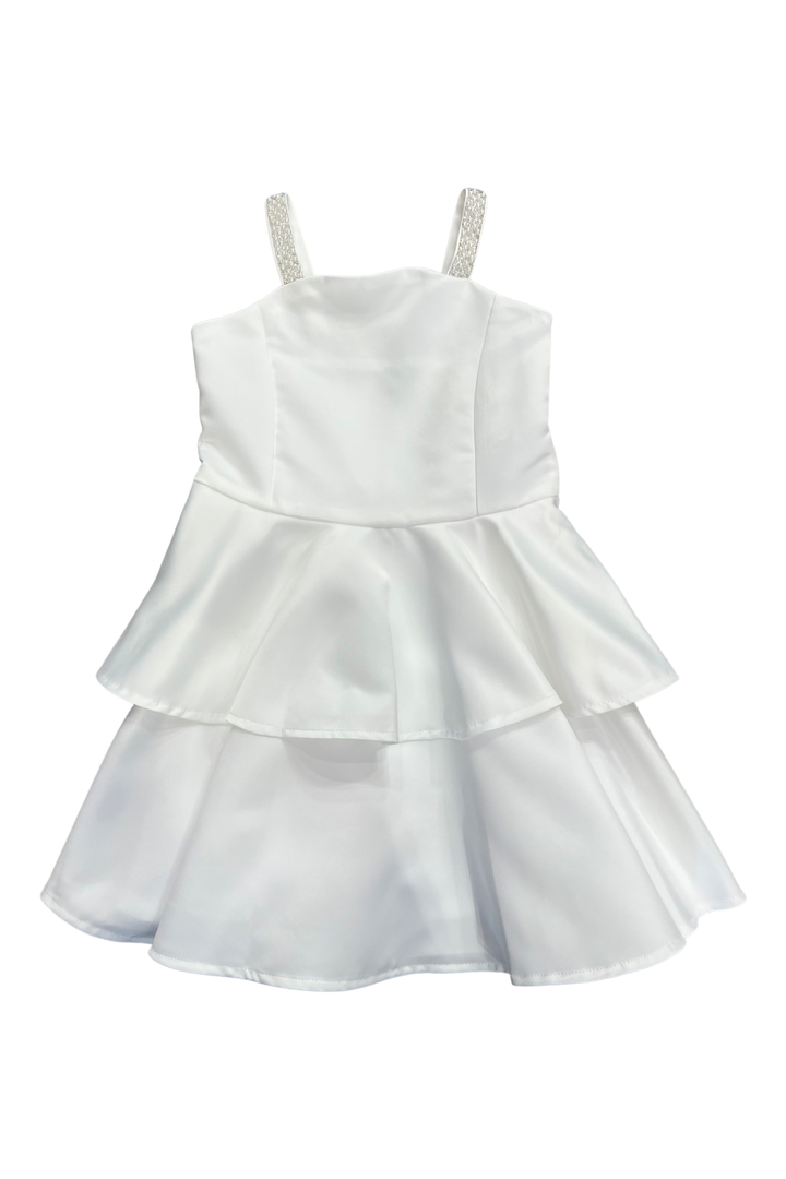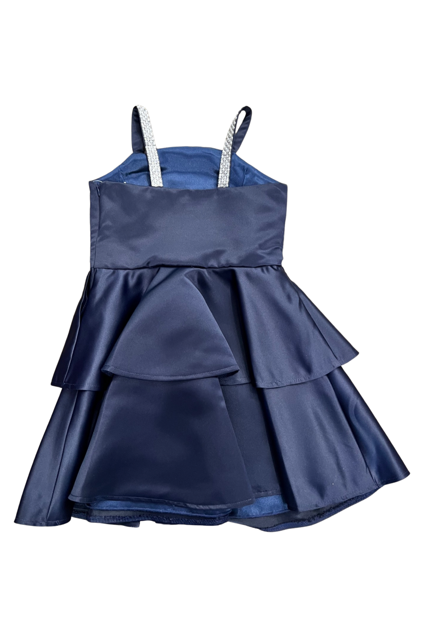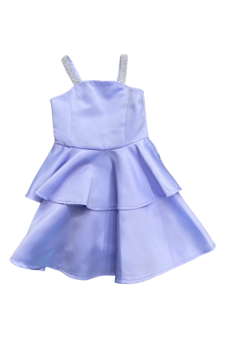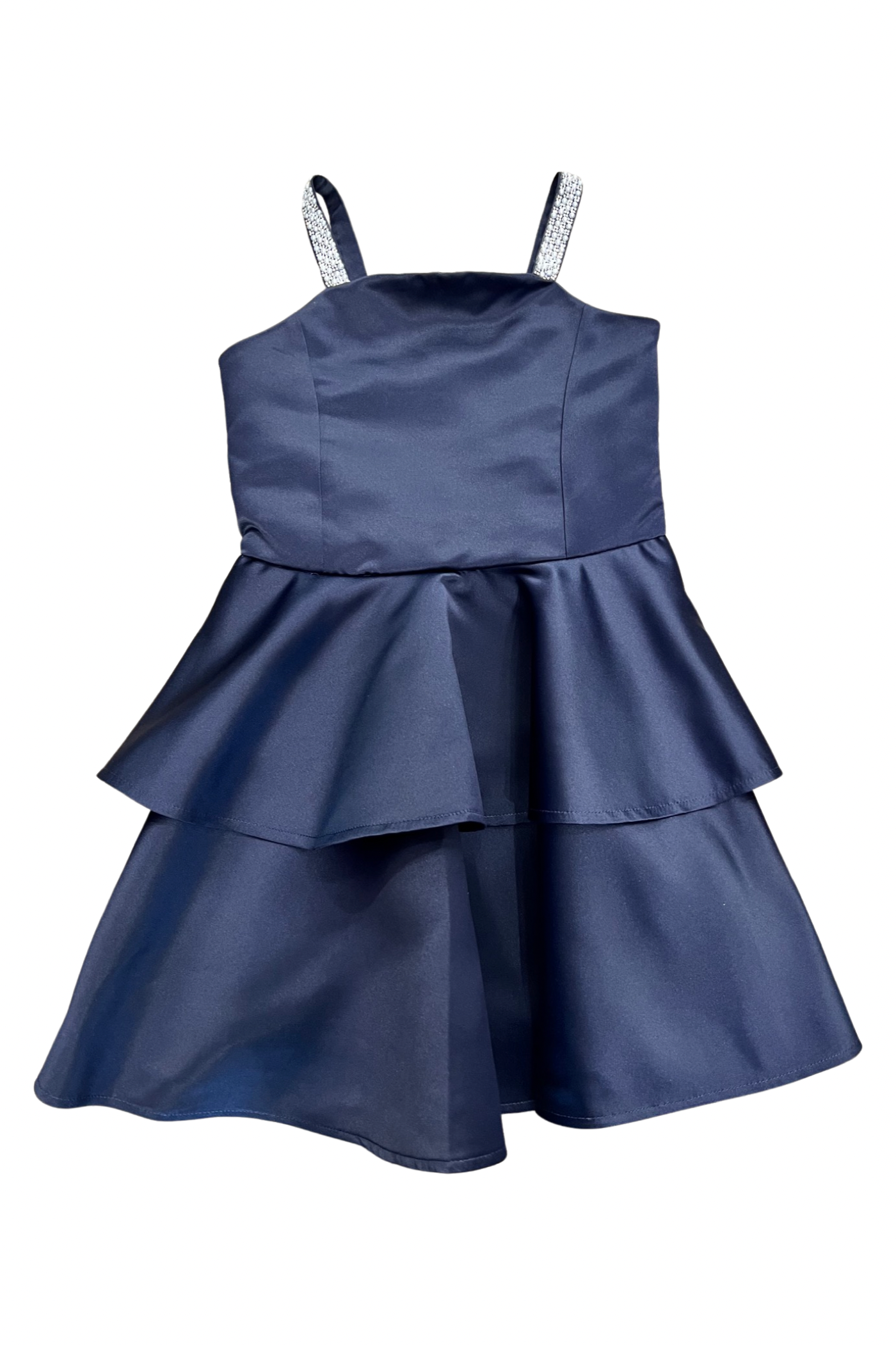 Satin slight sweetheart neckline party dress with pearl straps and tiered skirt. lined.