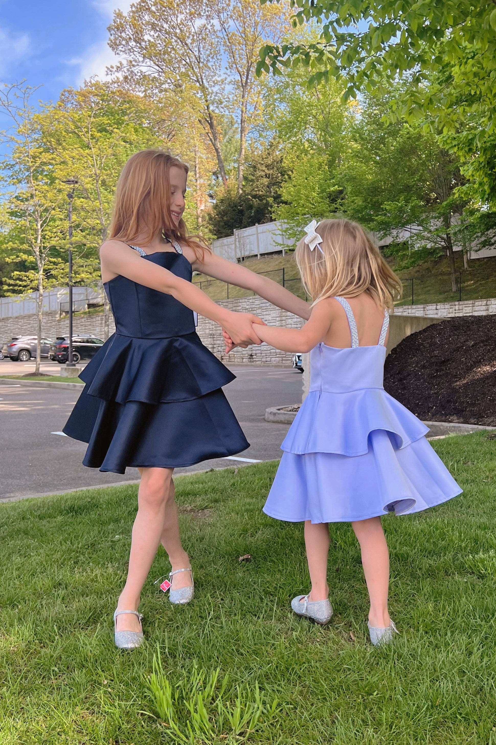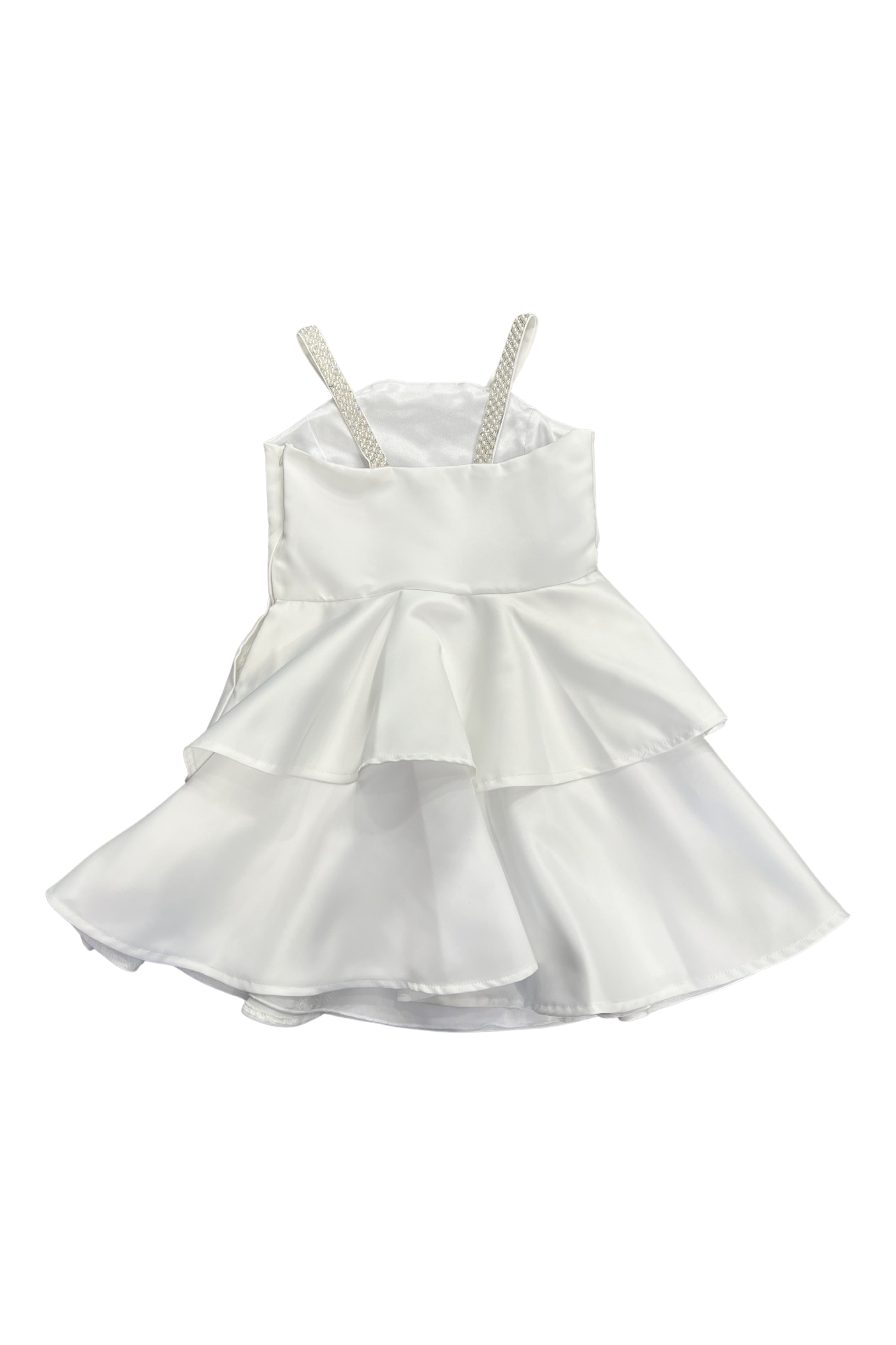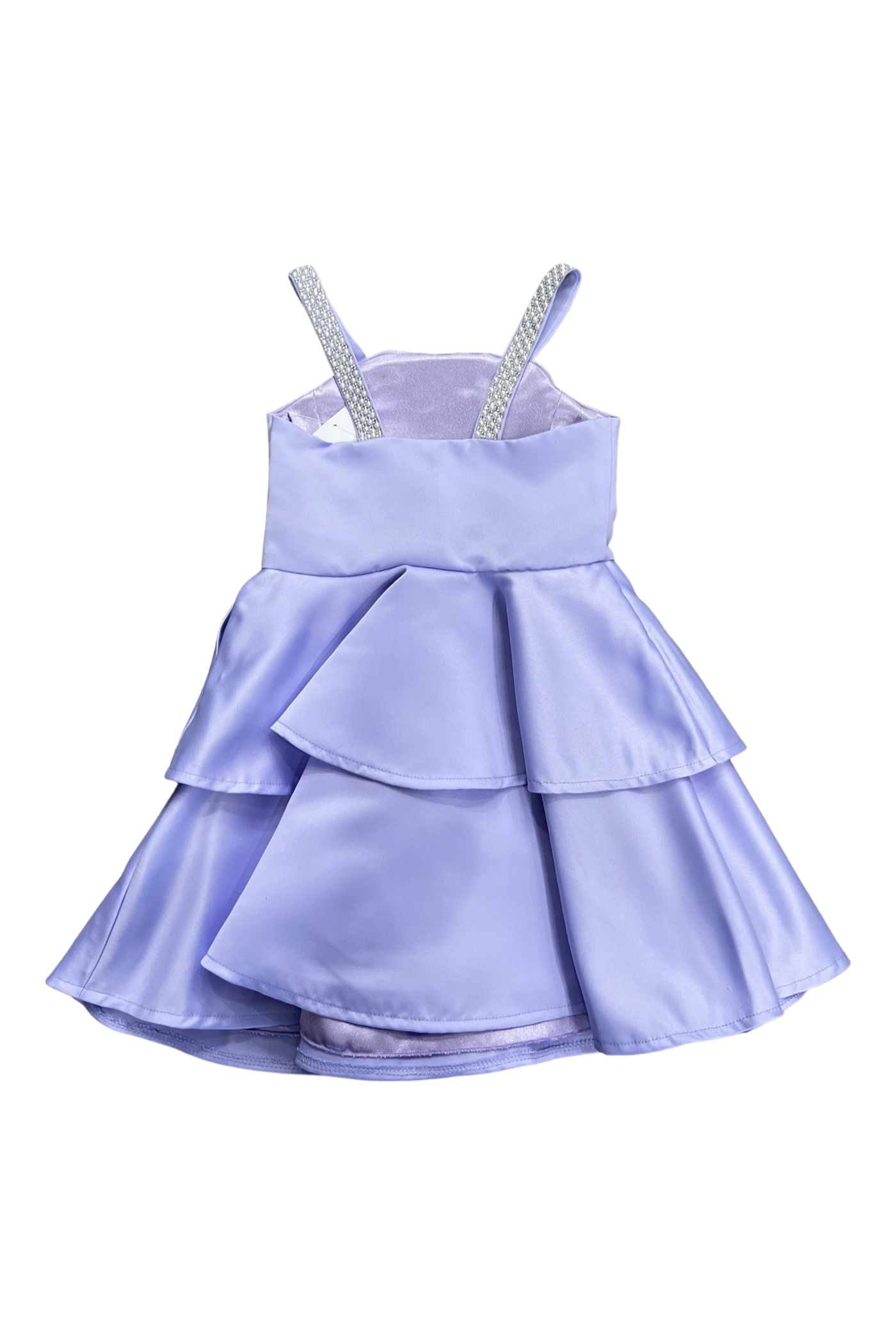 Satin slight sweetheart neckline party dress with pearl straps and tiered skirt. lined.