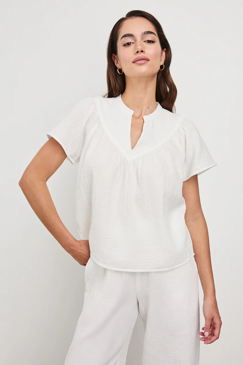 Crafted from soft, double-gauze cotton. With a v-neckline, baby doll body, and flared sleeve, the Sayer is an airy essential for the warmer months.