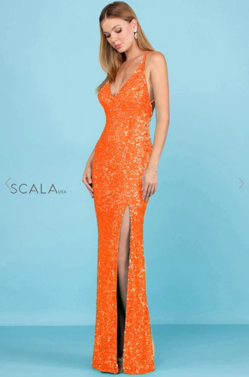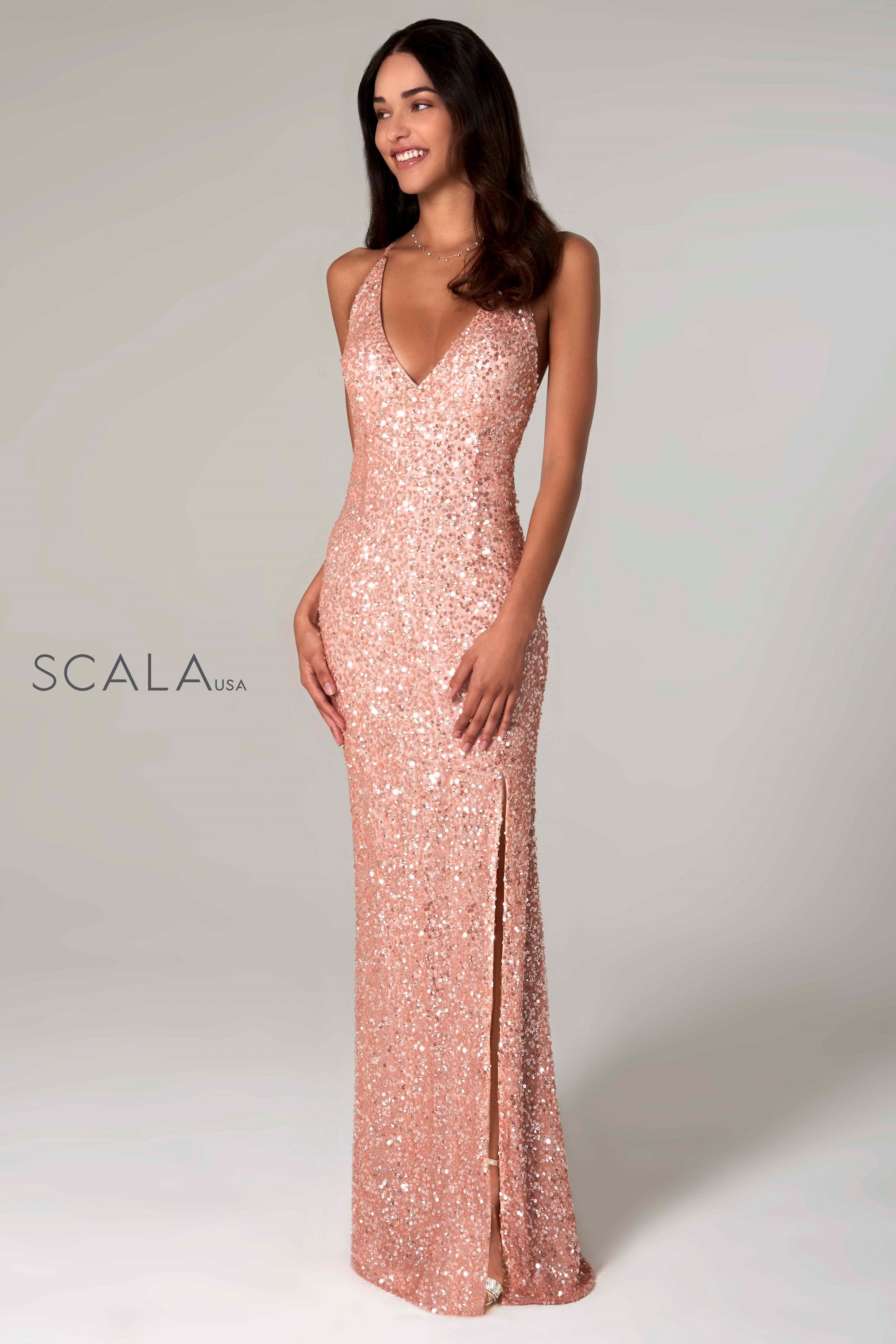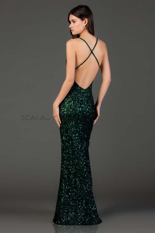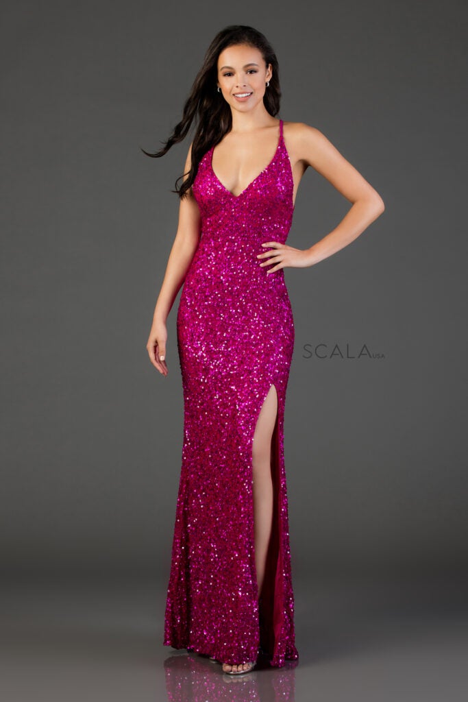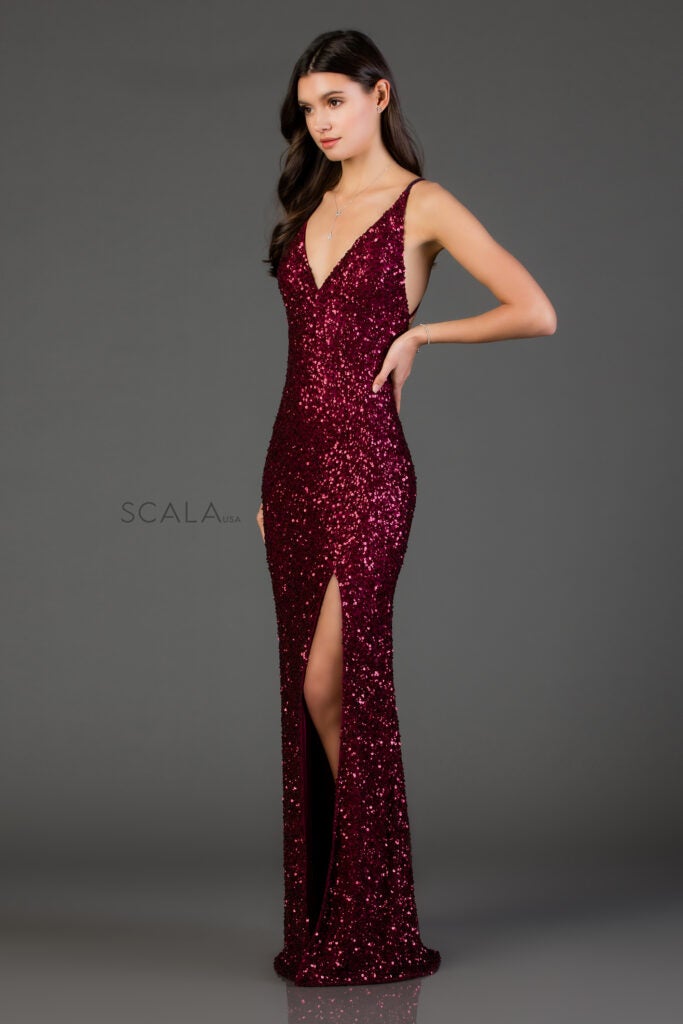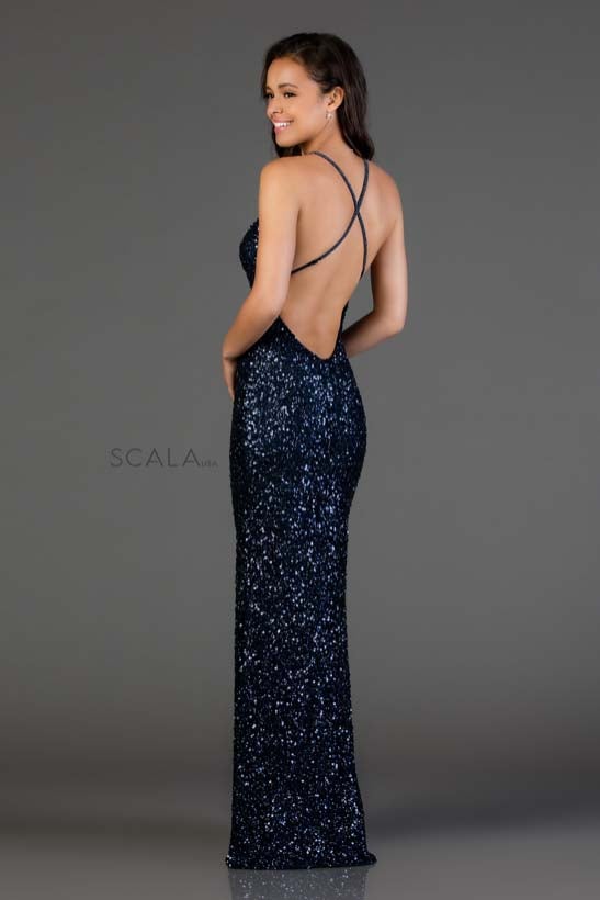 Look incredible in this stunning sequined prom dress 48949 by Scala. This sexy gown showcases a plunging v neckline and a slim fitting silhouette. A thigh high slit adds a sexy feature to the skirt while on the back of this gown a sexy low open back and criss cross closure completes this dramatic look.