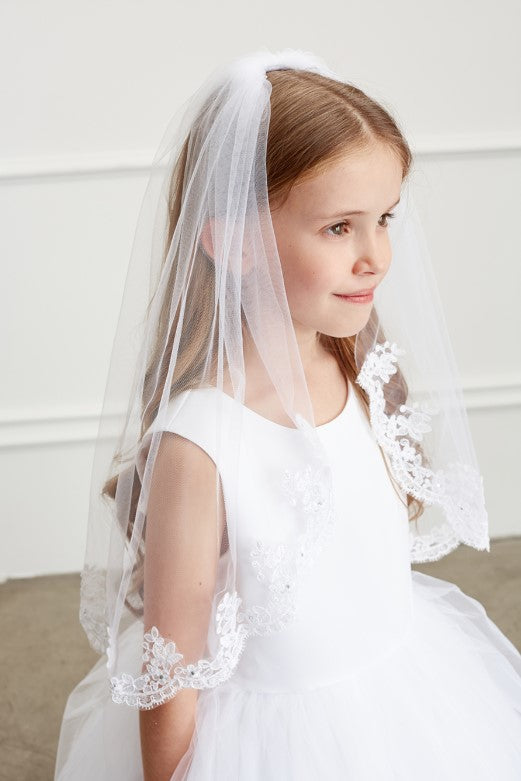 Girls Scalloped First Communion Veil with a Lace Applique Trim. on comb.