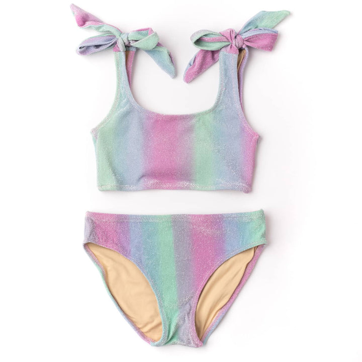 The Shimmer Bunny Tie Bikini in Ocean Ombre is the perfect swimsuit for your beach-loving girl! Made out of a soft, shimmery fabric that catches the sun's rays and creates an ever-changing ombre effect, it will be her new favorite suit!