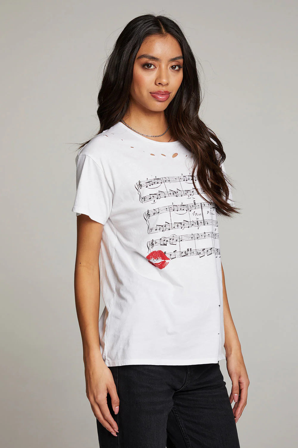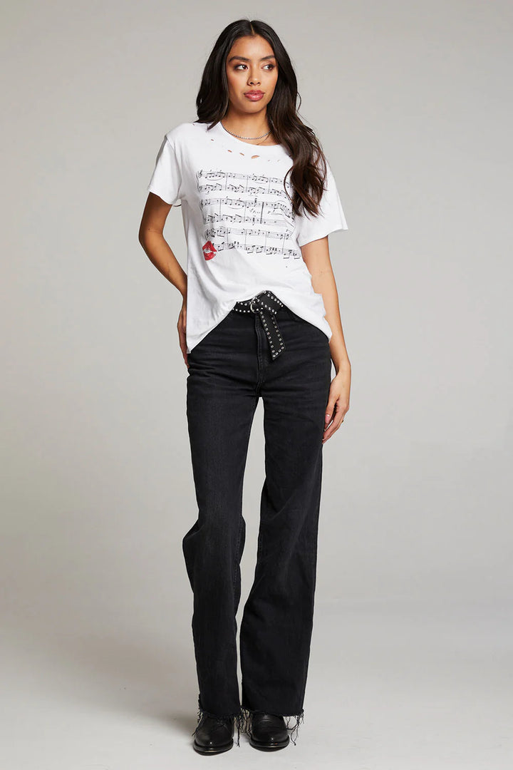 Let the music move you with this artistic style. The vintage softness of the cotton fabric is completed with distressed detailing, pairing perfectly with the simple print. Wear this when you want to tell them they make your heart sing.