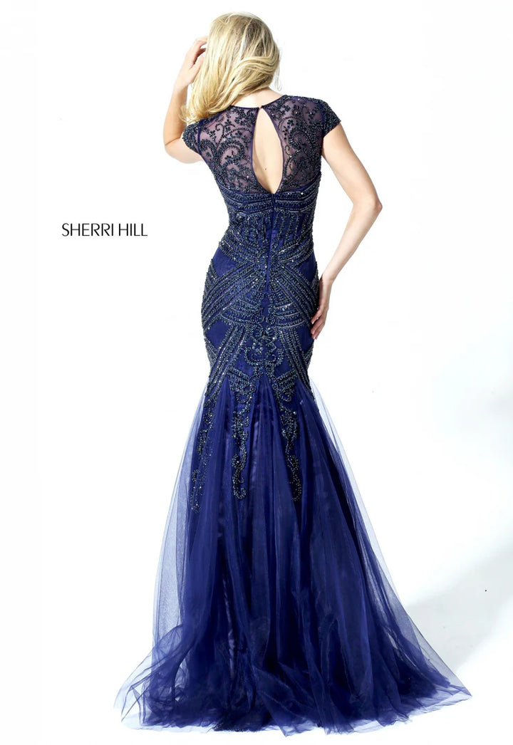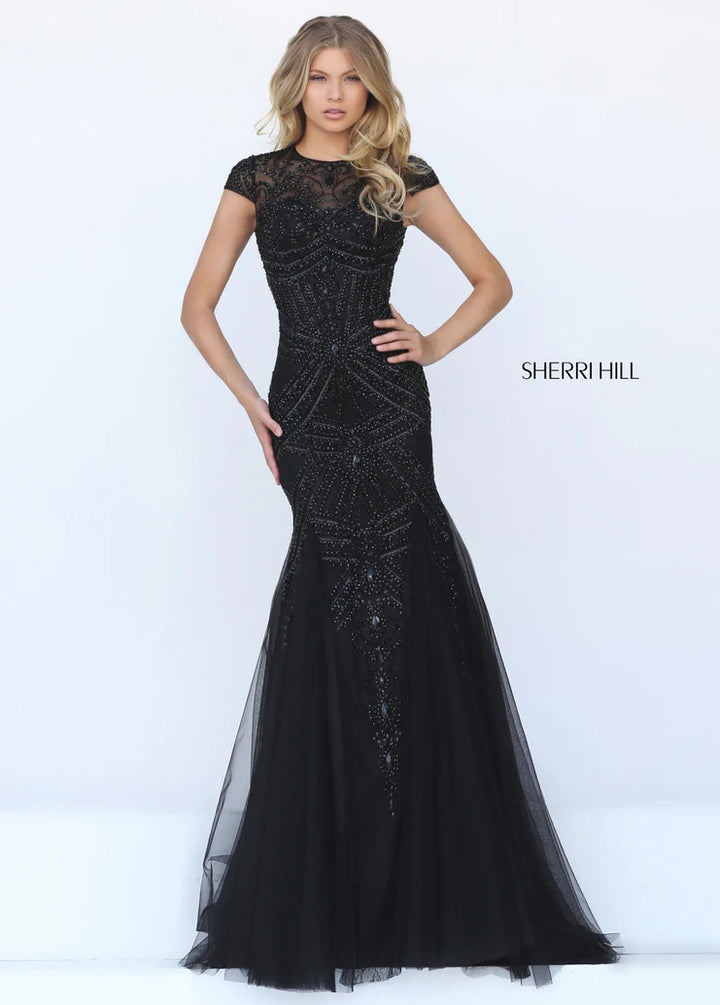 Beaded gown with cap sleeves and tulle mermaid skirt.