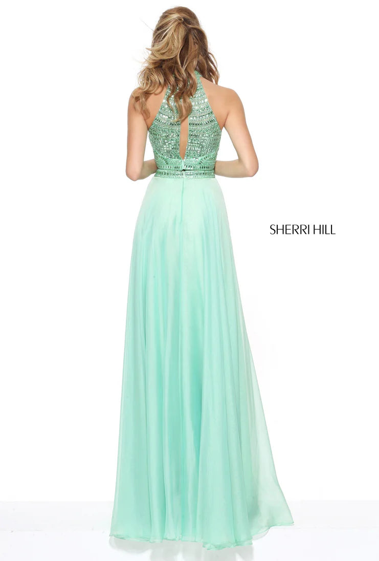 Two-piece high neck beaded bodice with a chiffon skirt.