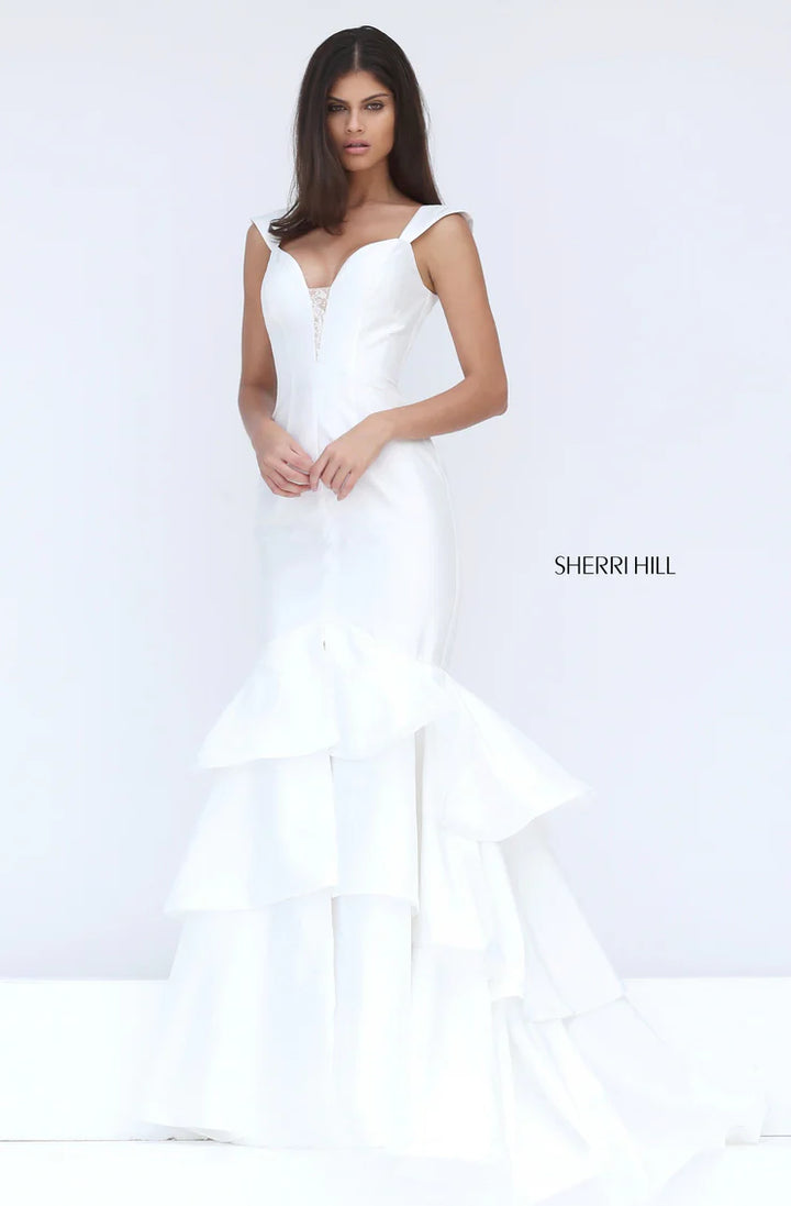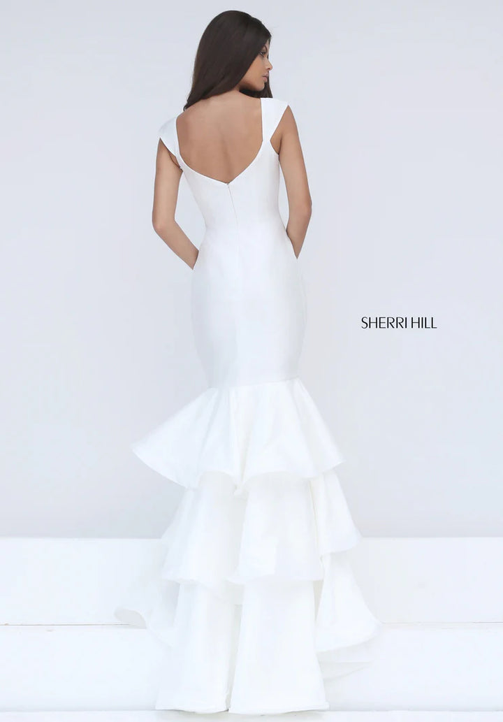 Two-piece high neck beaded bodice with a chiffon skirt.