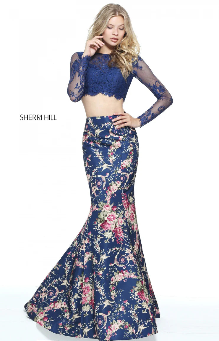 Two-piece floral print mermaid with a lace long sleeve bodice.