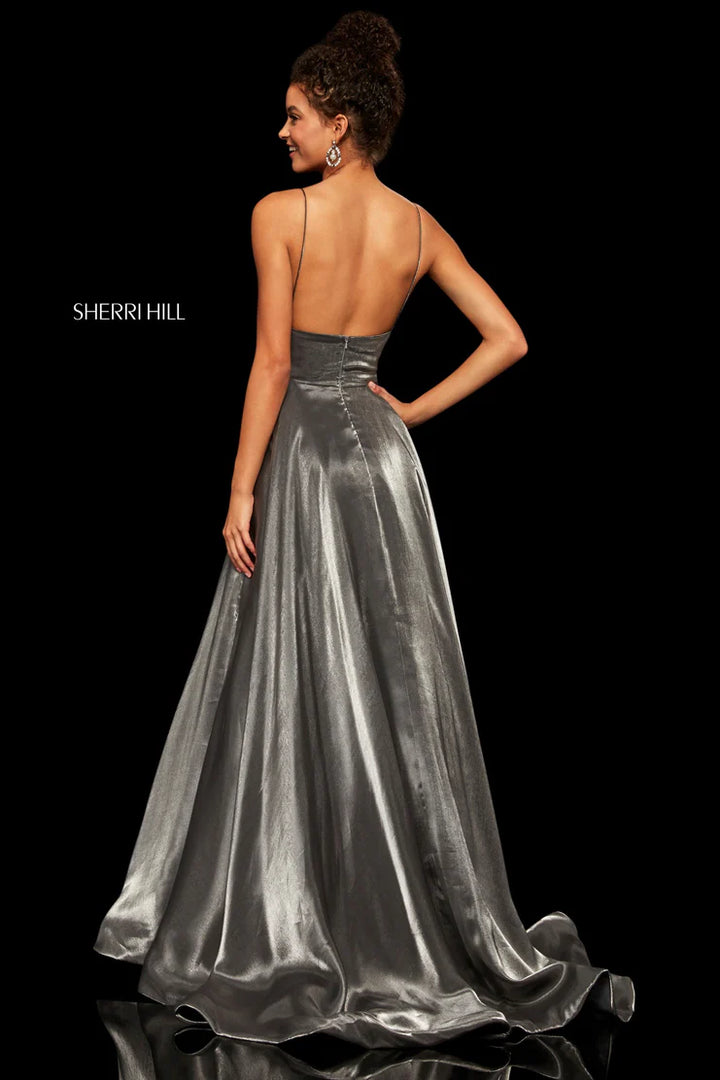 Rich metallic satin A-line dress with V neckline and spaghetti straps.