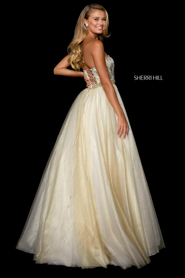 Strapless ball gown with brocade bodice with lace up back and glitter tulle skirt.