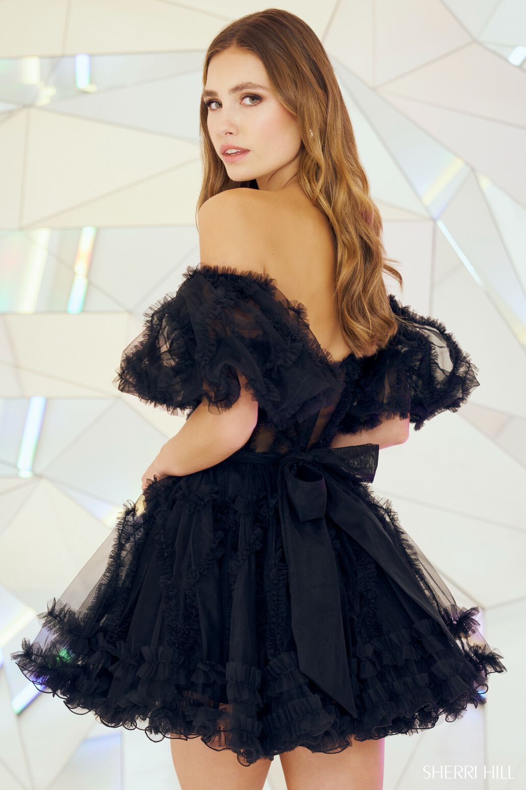 Tulle cocktail dress with sheer corset bodice, ruffle embellishments and ballon sleeves.