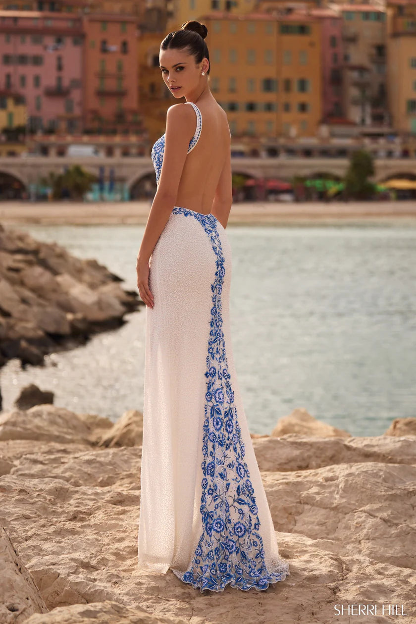 Beaded floral blue print gown with side cut out, open back and skirt slit.