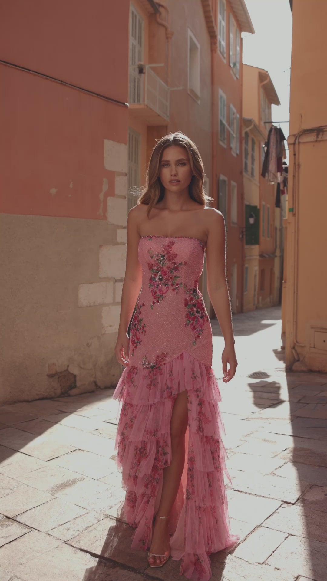 Floral beaded strapless gown with tulle ruffle skirt slit.