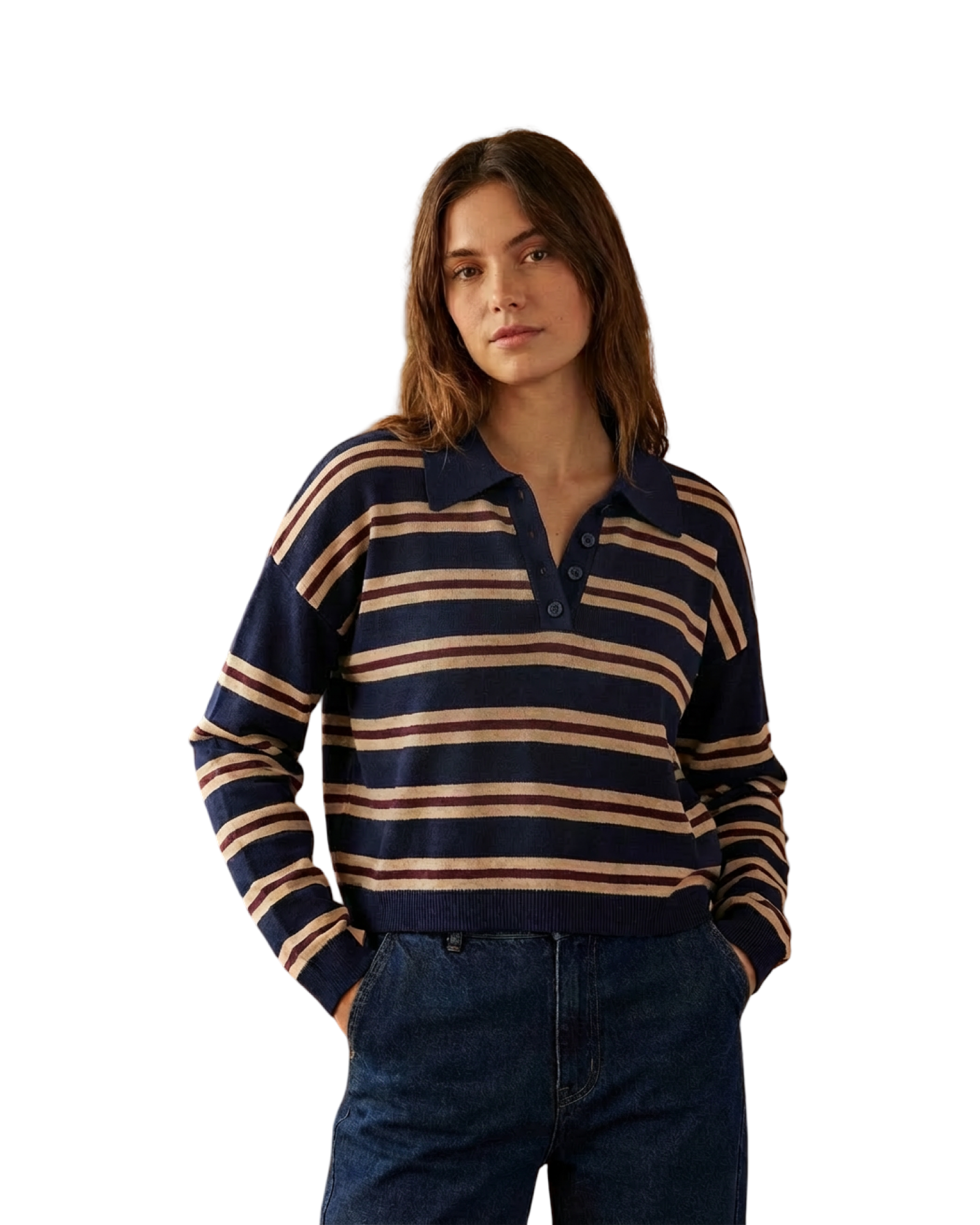 Effortless style meets everyday comfort in this striped polo knit top. The cropped silhouette and slightly boxy fit create a modern, relaxed look that flatters without clinging. The classic stripe pattern pairs seamlessly with your favorite bottoms.