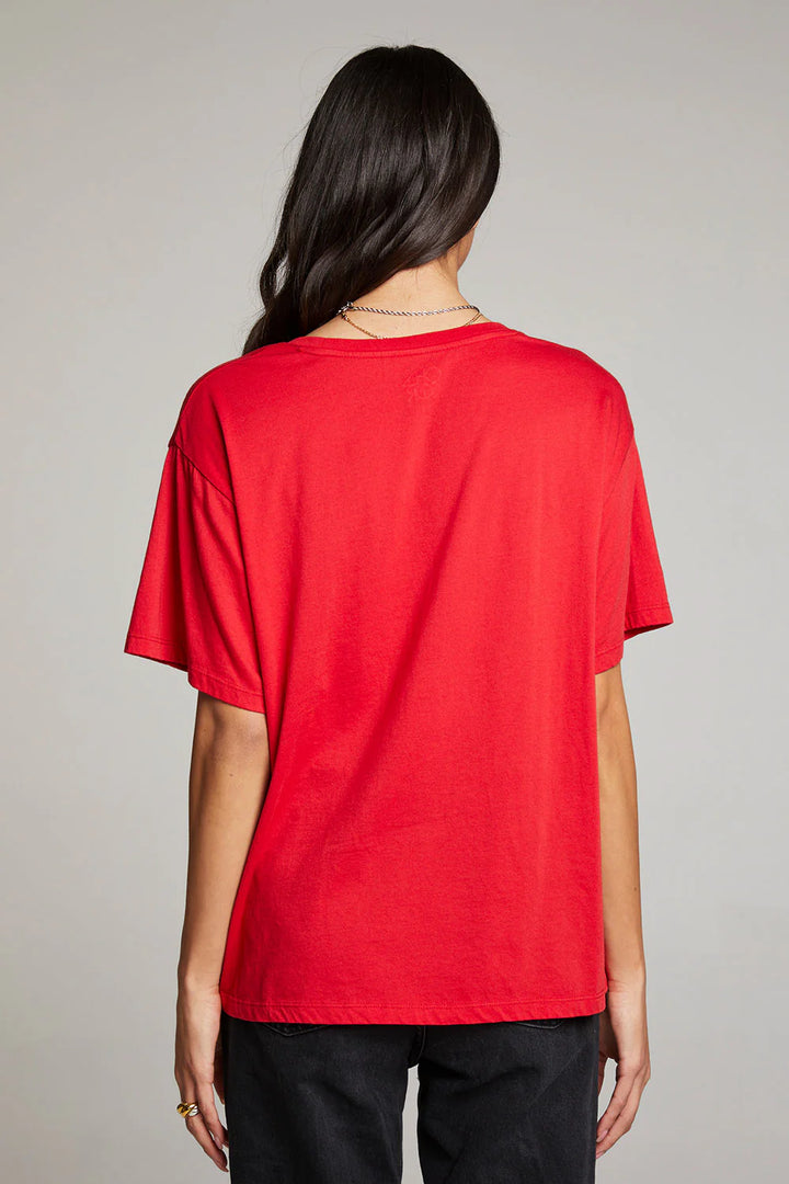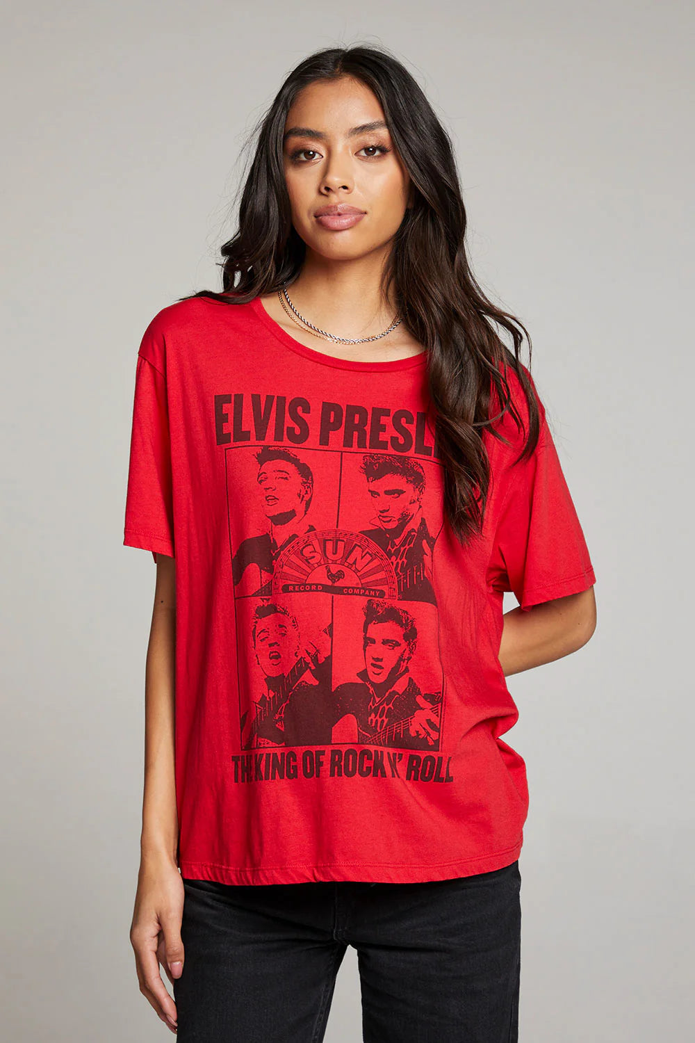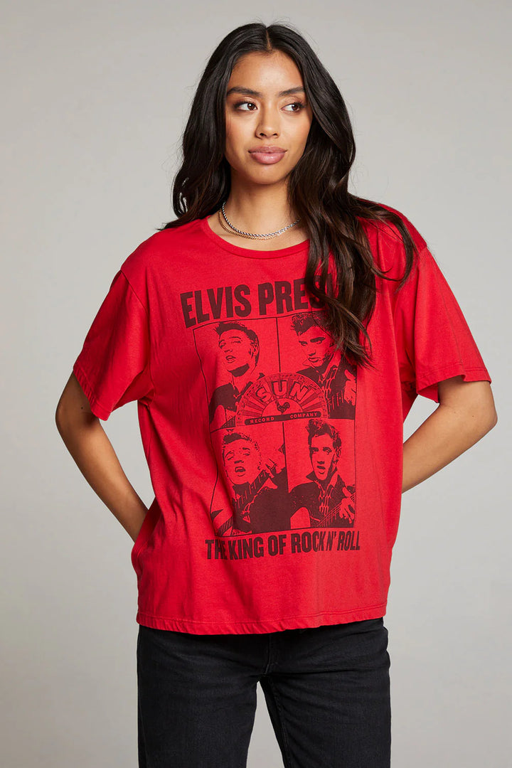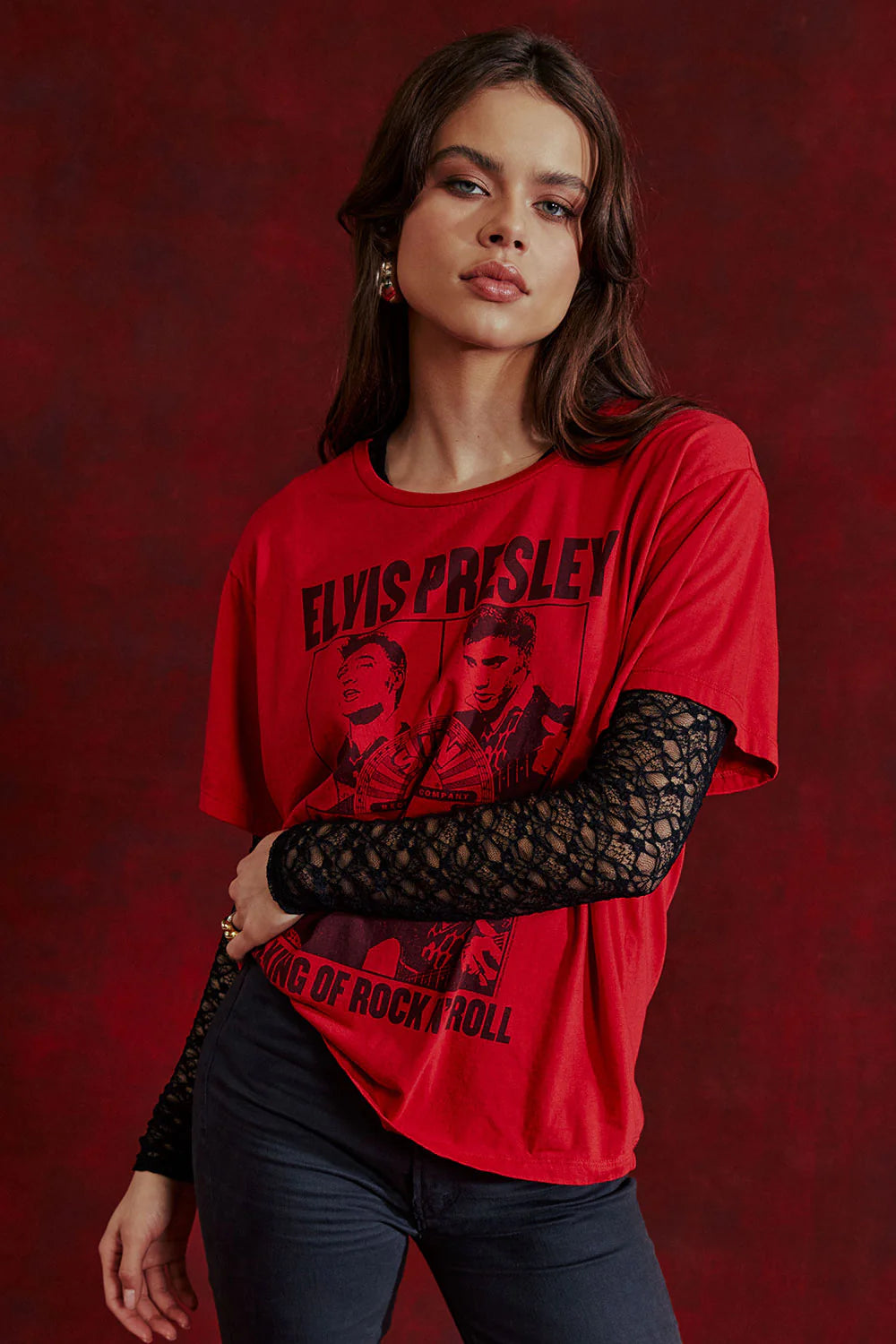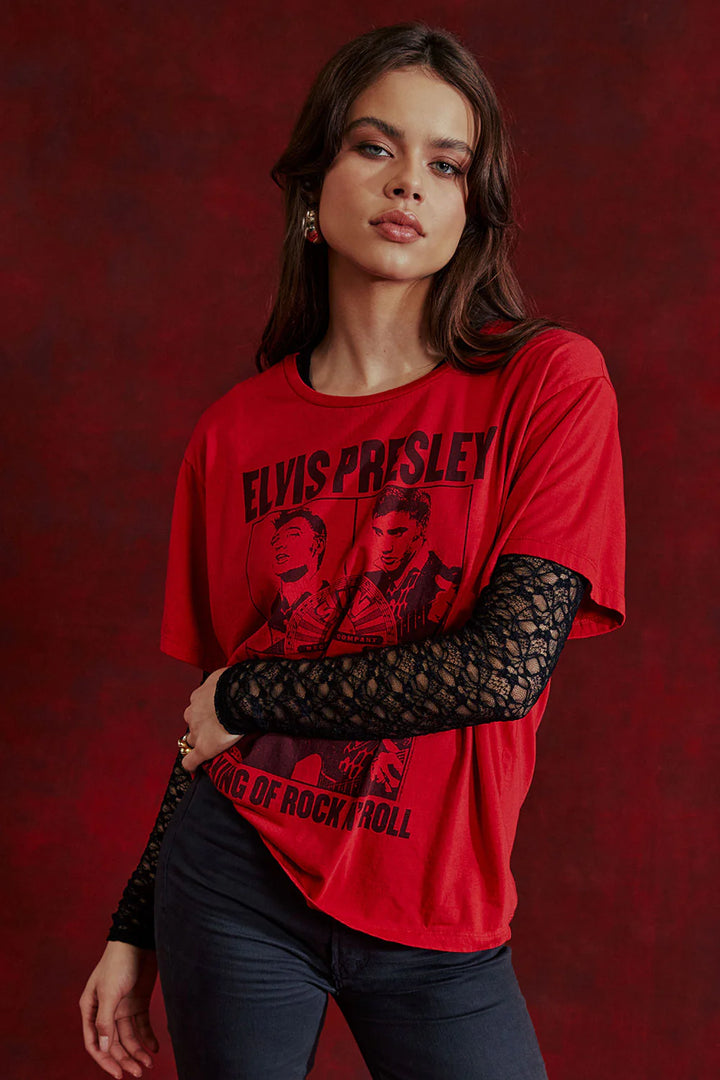 Set their souls on fire with this devil me care tee. With four images of the king himself printed black against a bright crimson backdrop, it’s sure to catch the eye. We love this easy, oversized look .