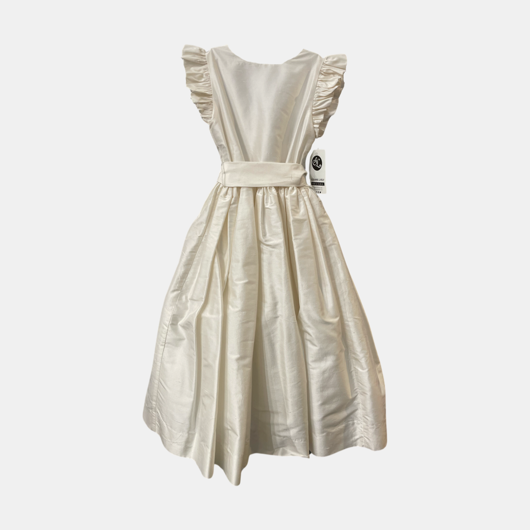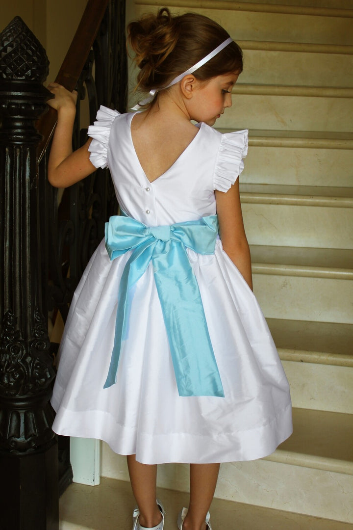 White silk flutter sleeve t-length dress with sash. Our stock piece is white silk ( slightly off white), but can be ordered in white taffeta as shown. Prices will vary depending on size or color.