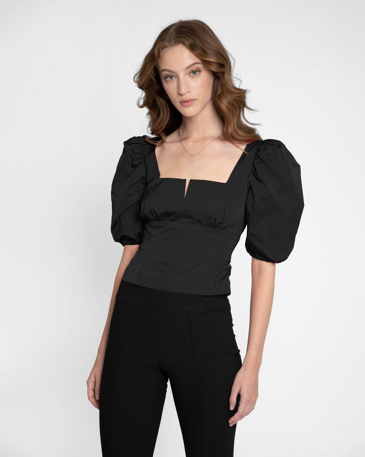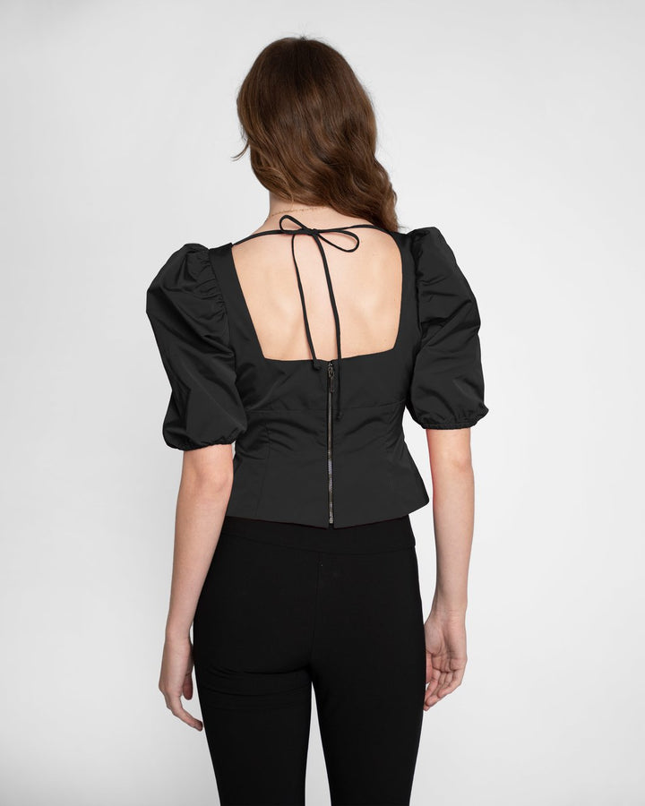 Black taffeta square neck top with puff sleeve. back tie and exposed back zipper.