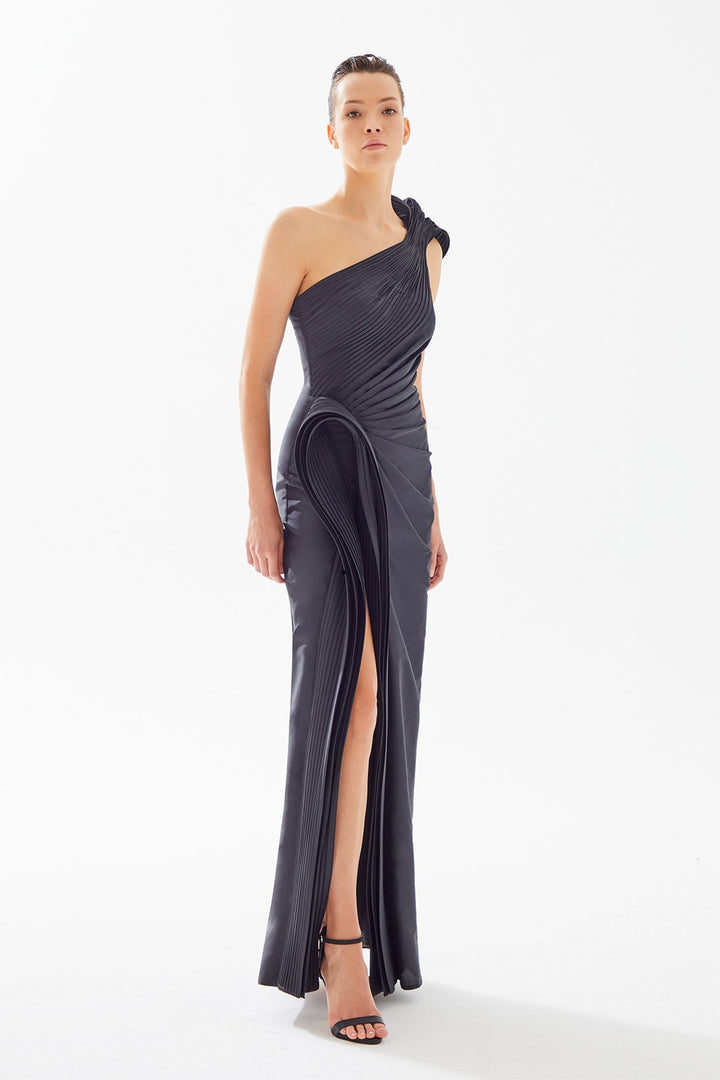 One shoulder asymmetrical 3d plise gown. Tarik Ediz style 92860