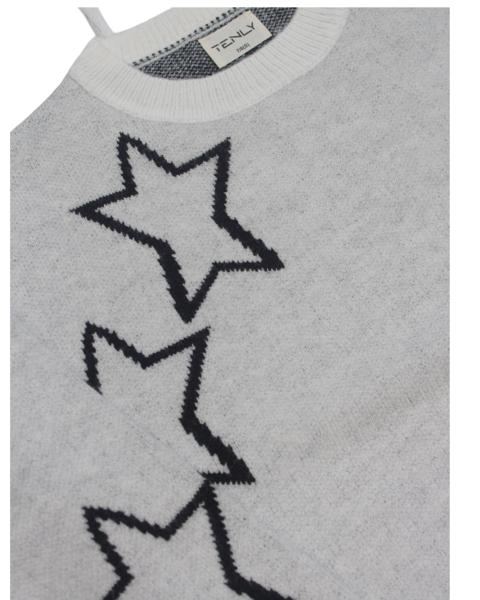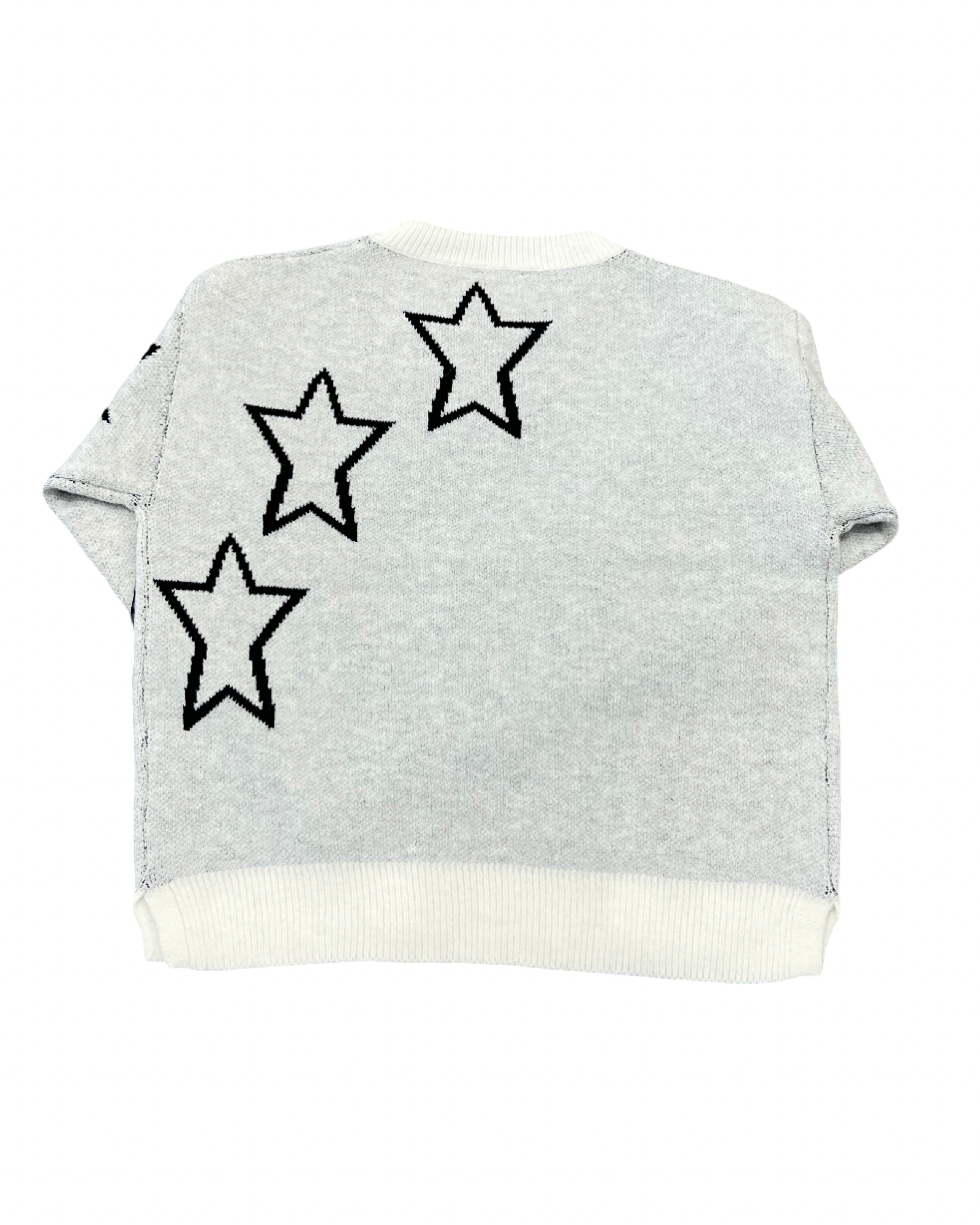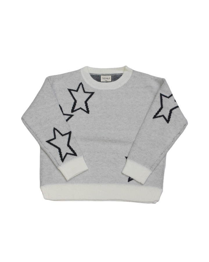 This cozy girls' sweater features a charming stars pattern in classic ivory and black tones. Its boxy fit offers comfortable movement and a modern silhouette, perfect for everyday play or relaxed outings. Stay warm and stylish with this versatile piece designed for effortless layering.