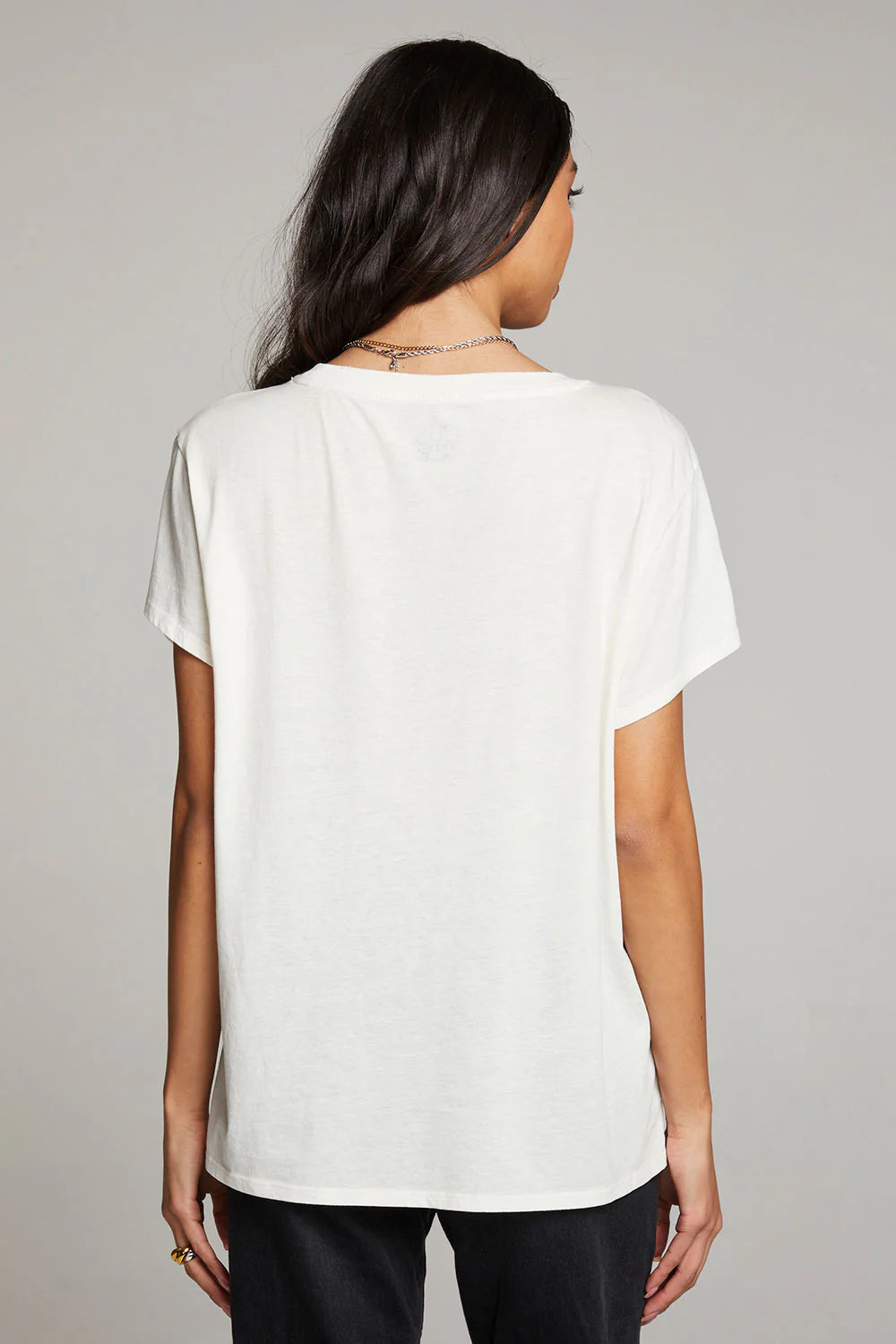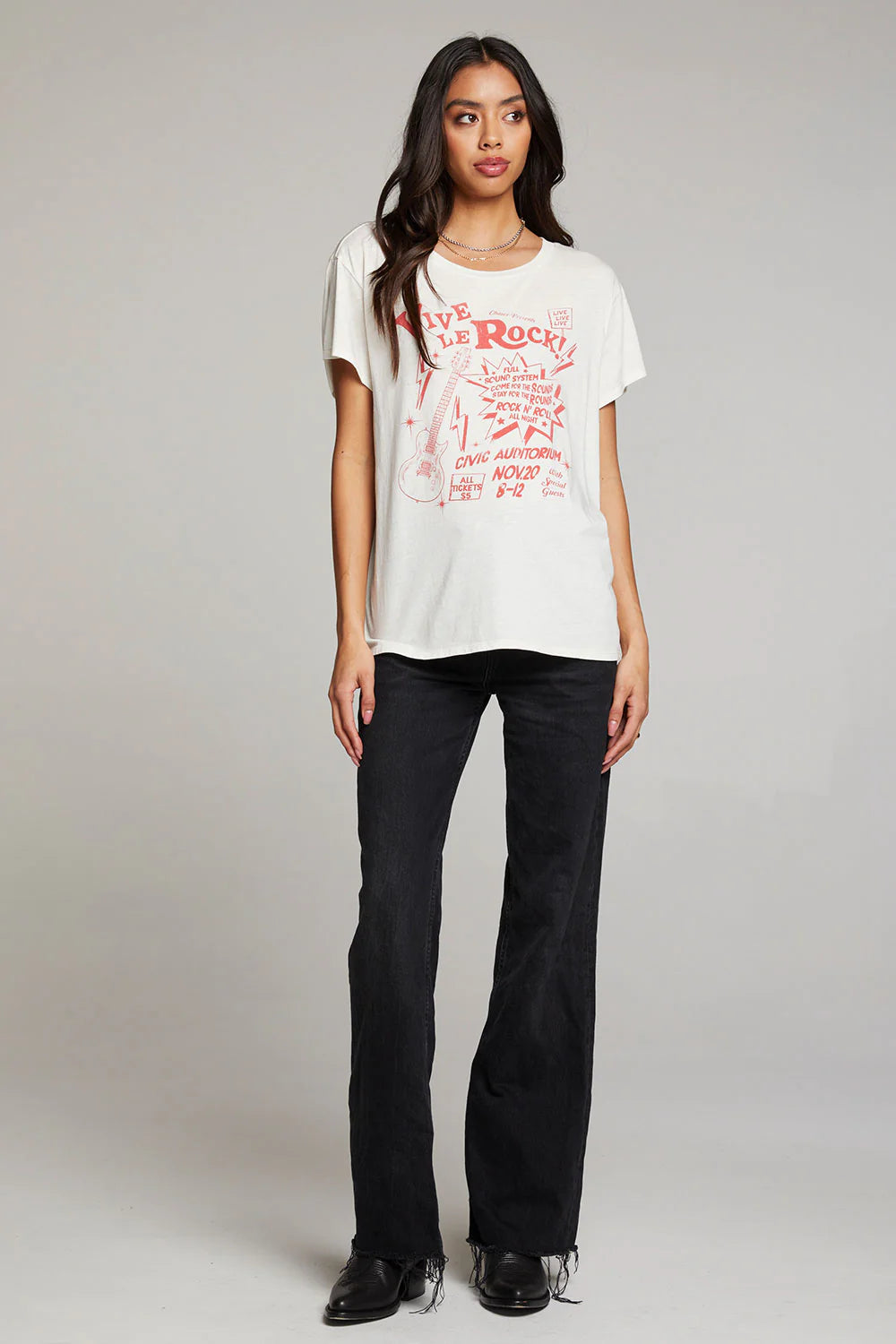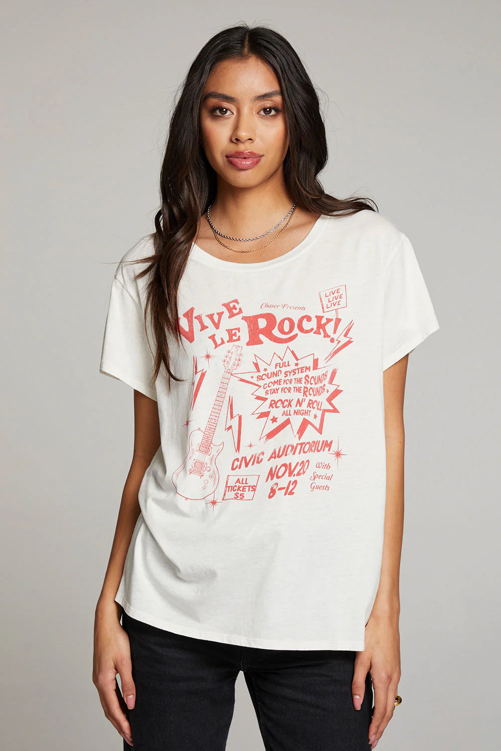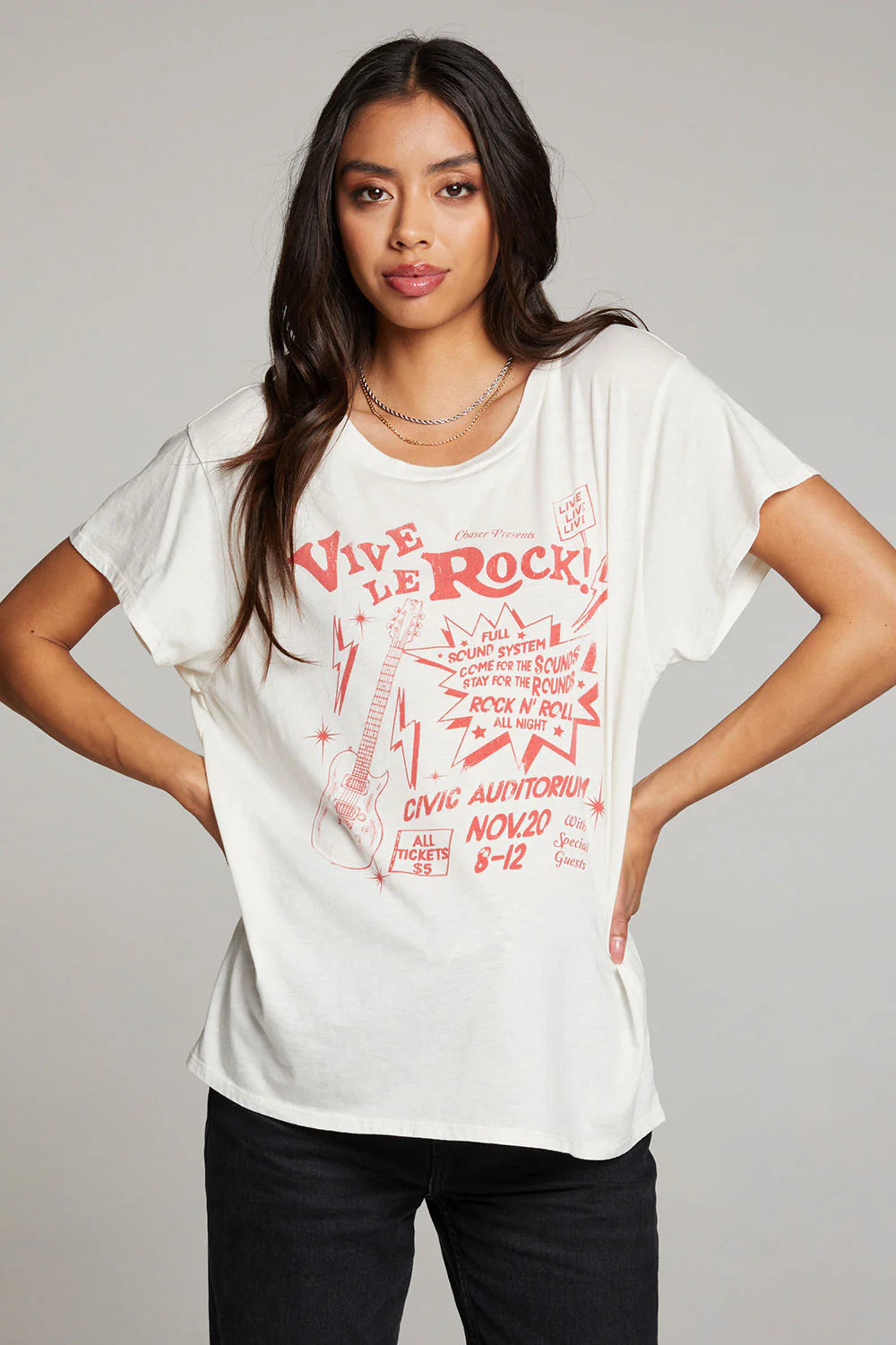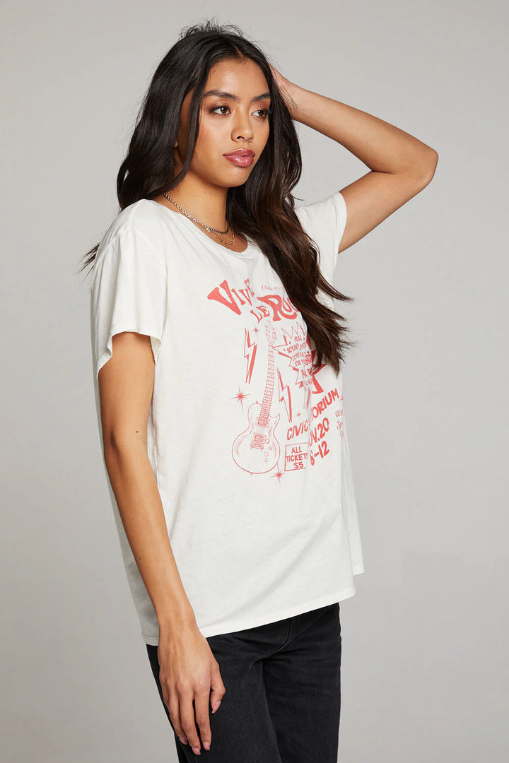 You love rock n’ roll, so let it show with this vintage inspired design. Bright red screen printed detailing pops against the soft almond background. The easy, generous fit pairs perfectly with your favorite pair of jeans.