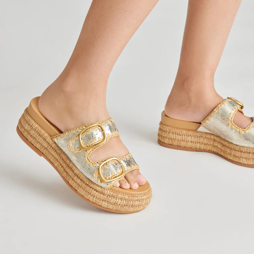 Earthy meets edgy. Dolce Vita WANIKA pairs buckle detailing with boho-chic raffia, creating a cool juxtaposition that's just as at home at the beach resort as it is in the city.