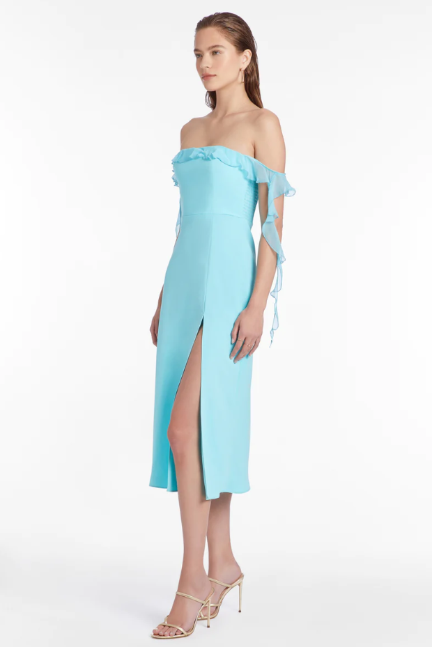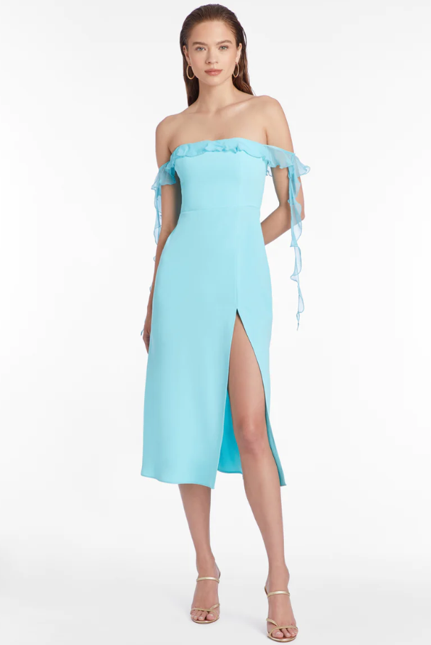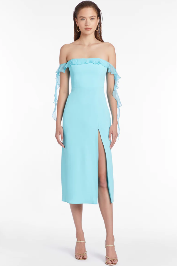 Amanda Uprichard off shoulder copellia dress in wave blue.