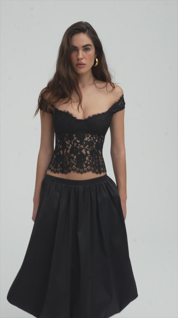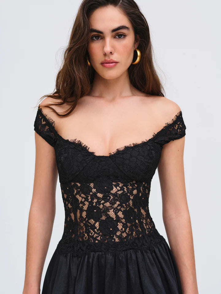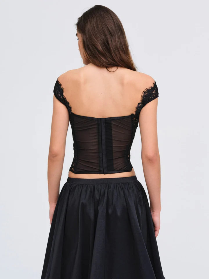 Embody a sense of timelessness with the ultra-sexy For Love & Lemons Waverly black lace top—a corset top with an off-the-shoulder neckline and scalloped edges.