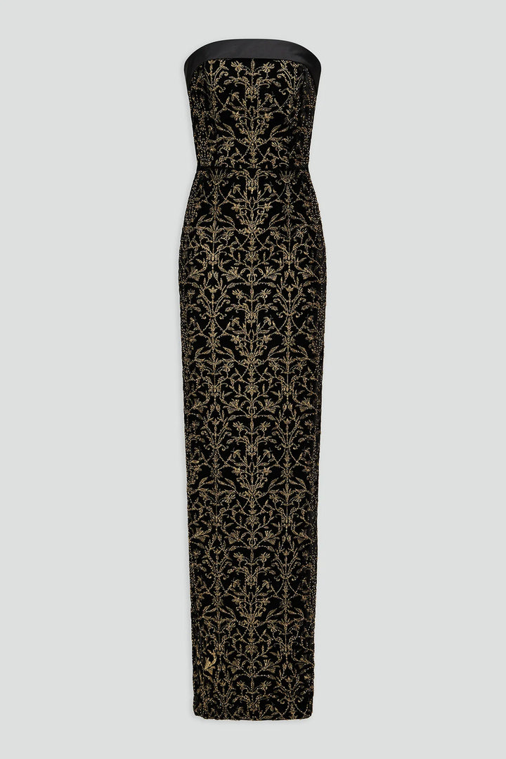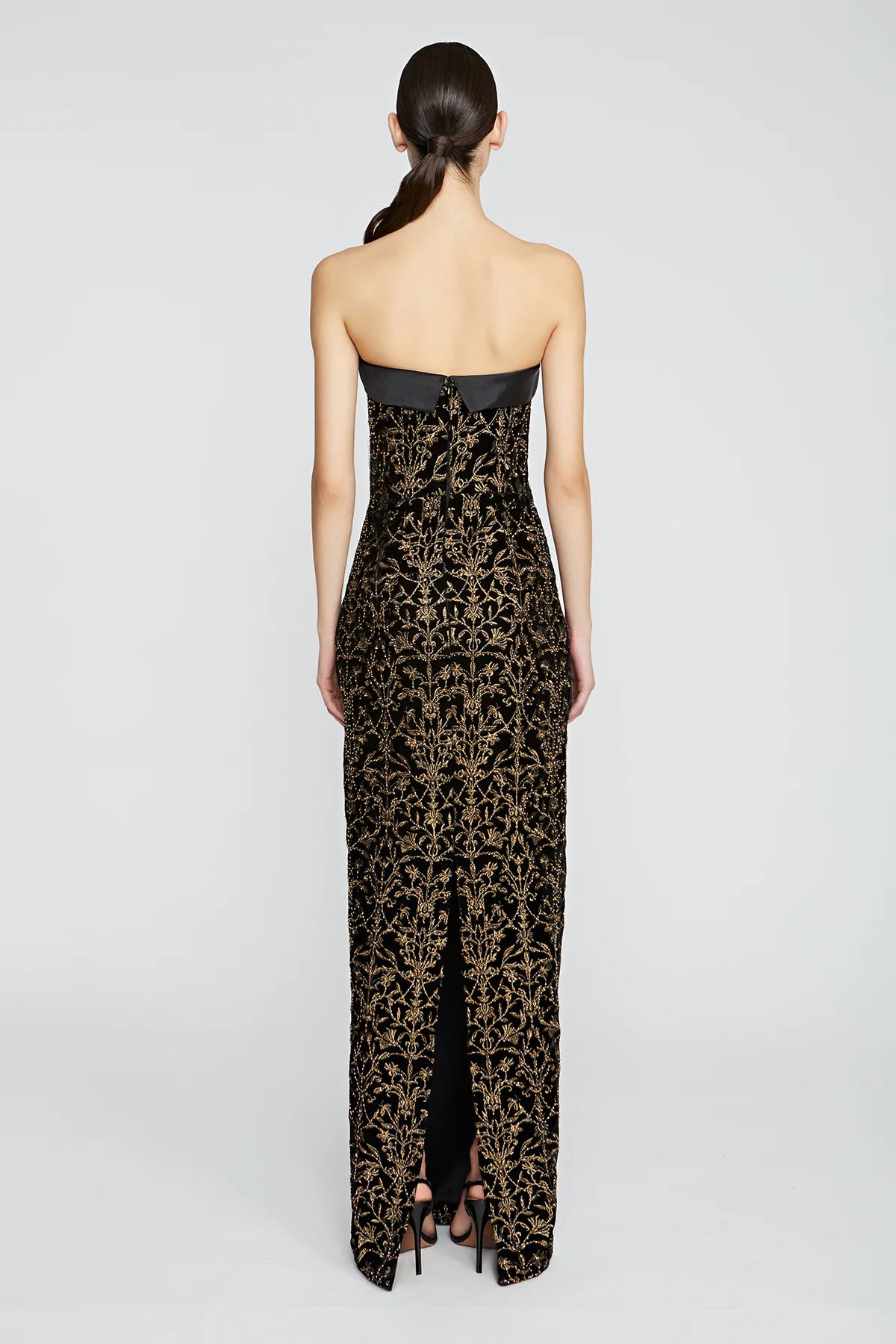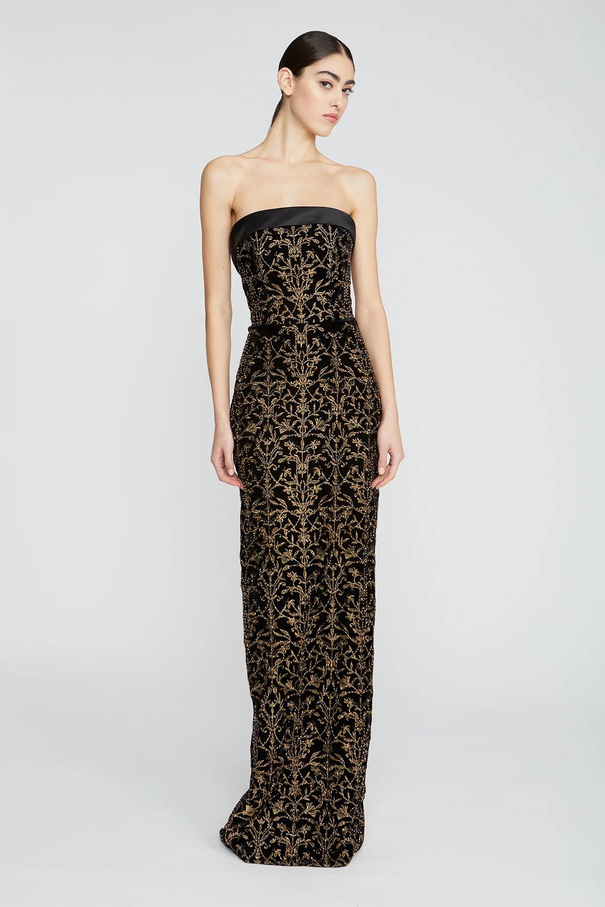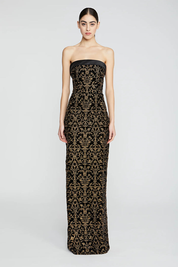 Immerse yourself in timeless elegance with this beaded stretch velvet column gown, featuring a Mikado neck band. This gown draws from Art Nouveau and is adorned with a dainty symmetrical pattern of gold beads. It combines classic sophistication with artistic flair for a standout look at any formal event.