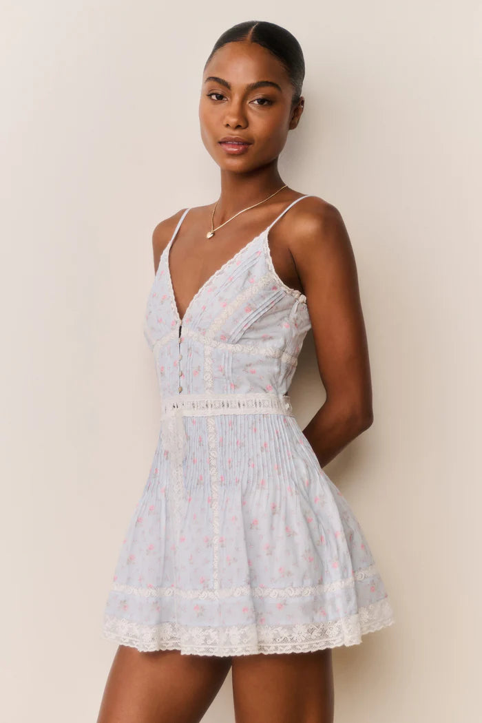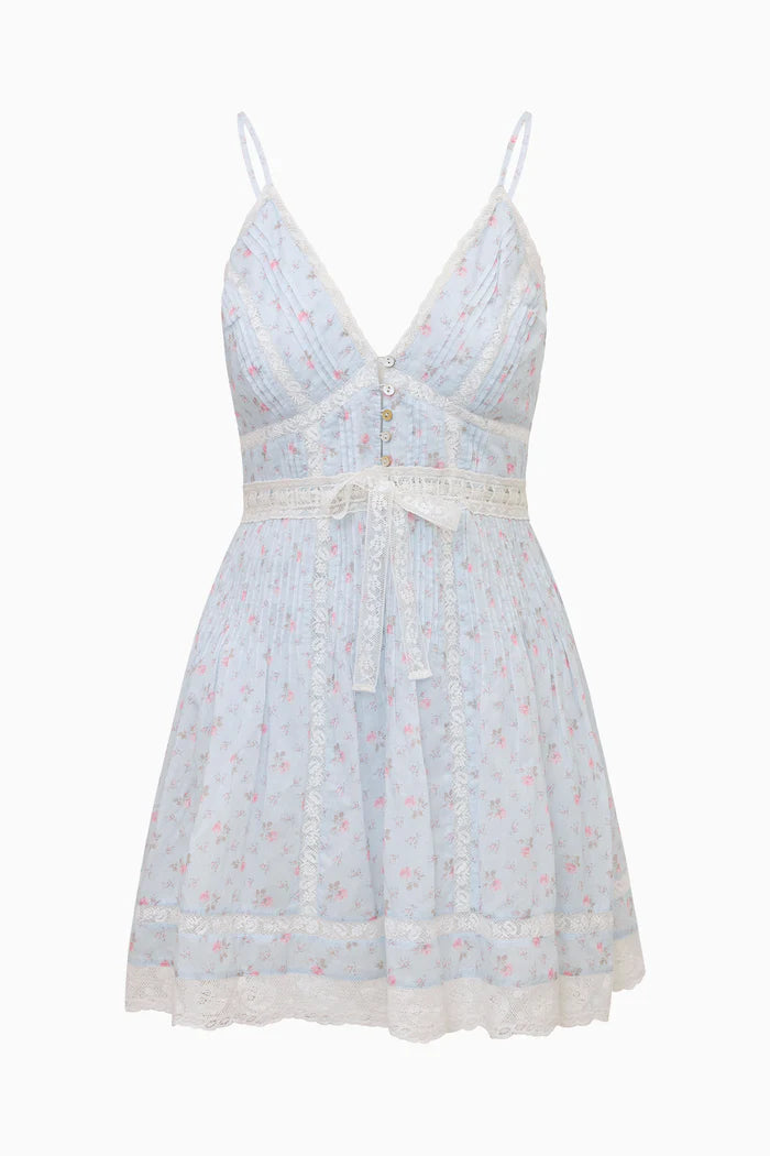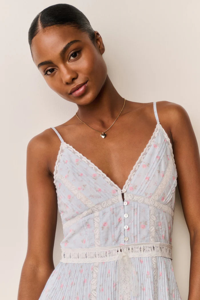 The Zirelle Sundress is an airy, feel-good favorite crafted in a lightweight cotton. A V-neckline and button-down placket are framed by slim spaghetti straps, while crochet trim and shirring at the waist add quiet dimension. A ditsy floral print and straight hem complete this understated, feminine look.