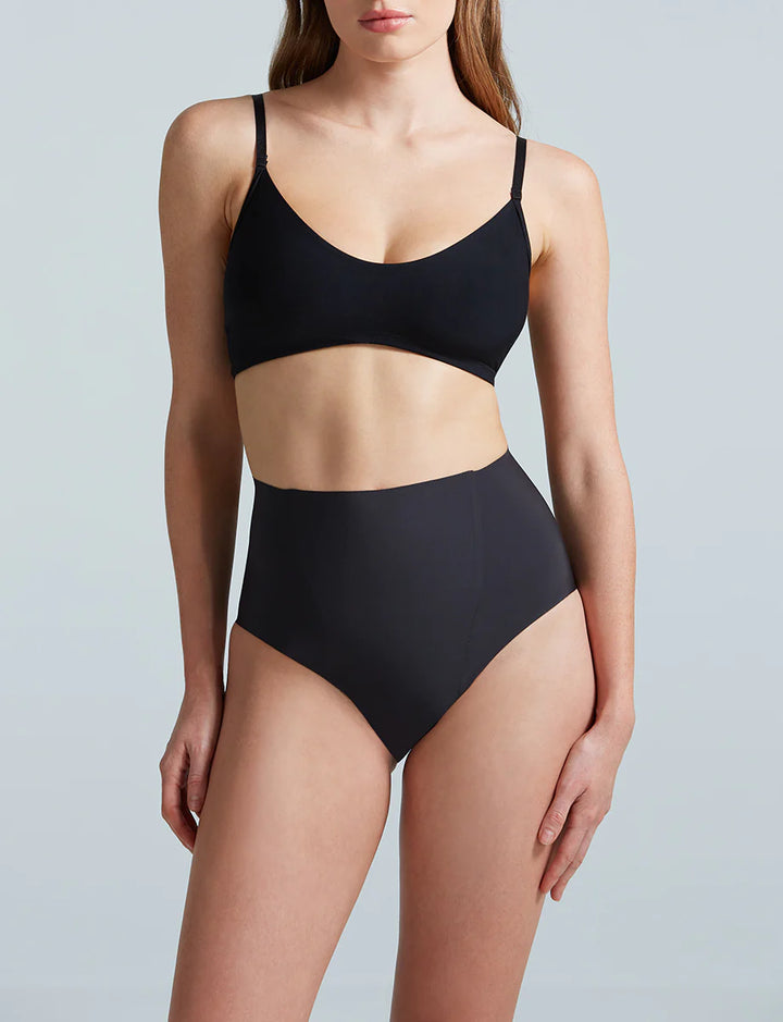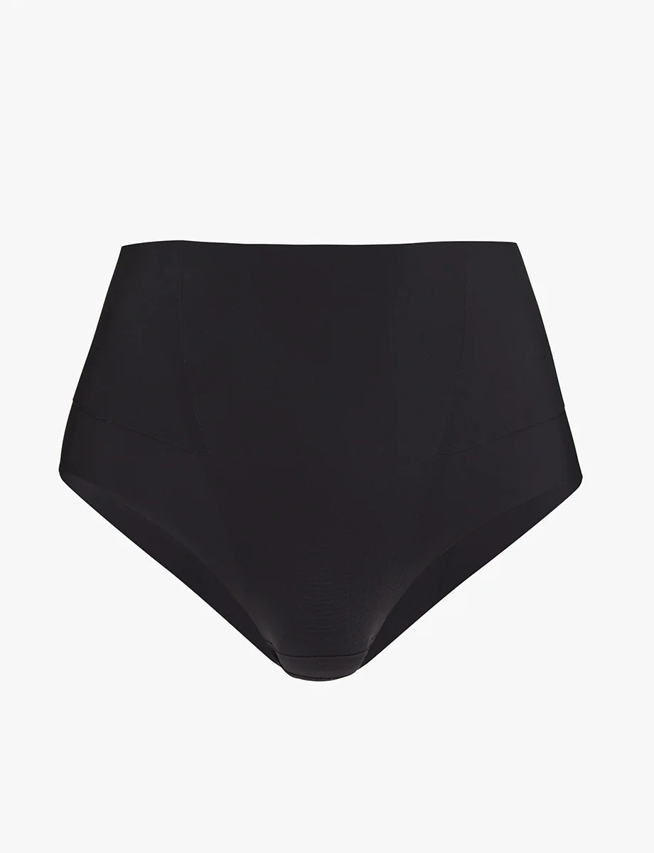 Commando's Zone Smoothing Shapewear Brief features a super-high rise waist, our signature raw-cut hem, and light-medium compression. This style offers extra-targeted smoothing properties through zoned smoothing panels, while still offering a seamless and smooth undergarment effect.